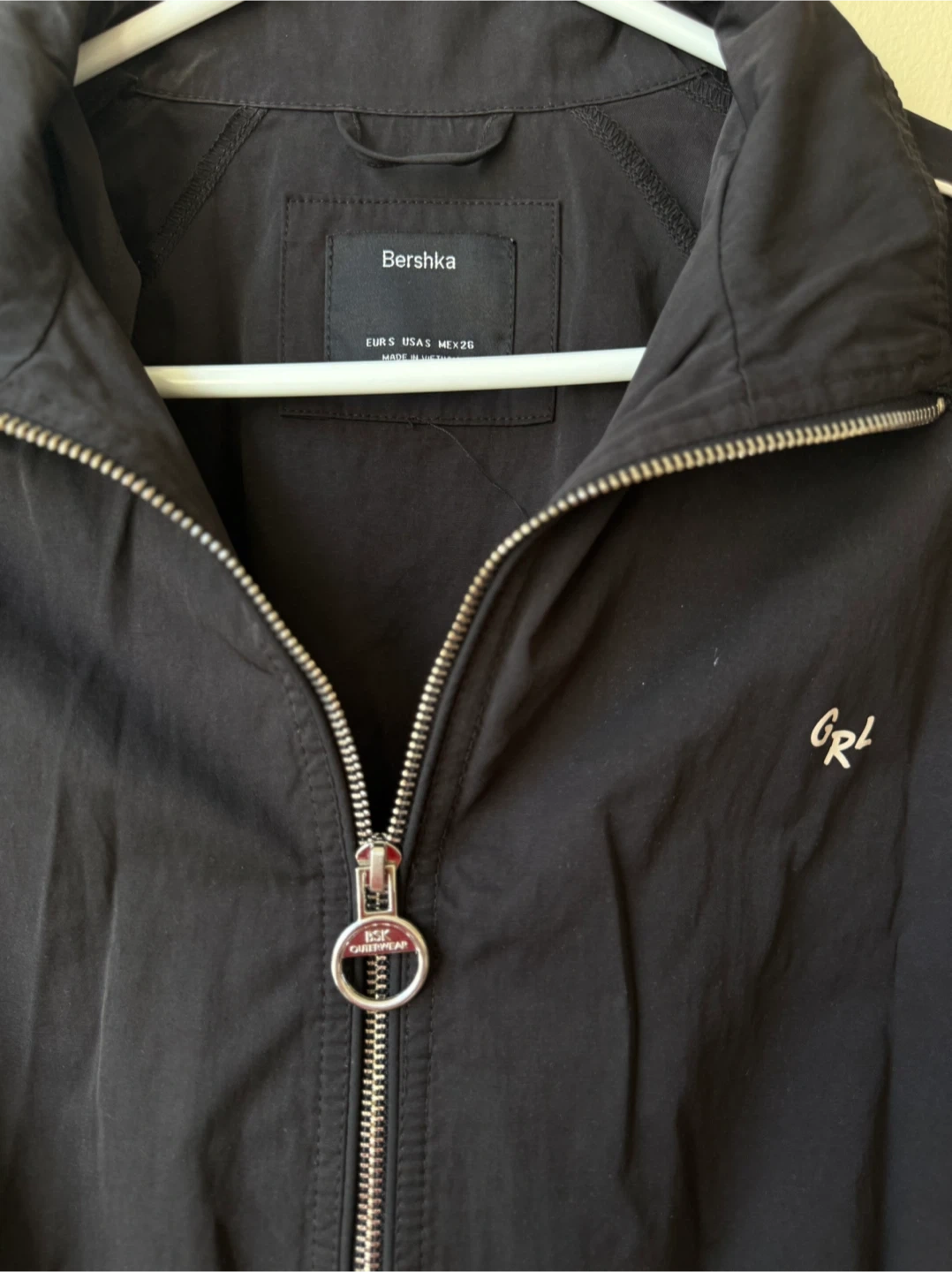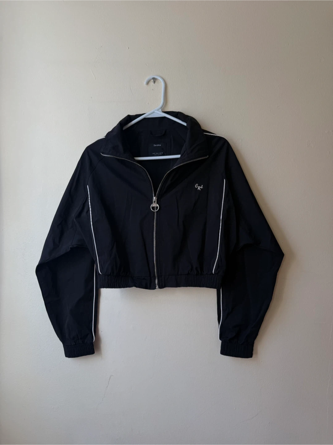 A stylish black cropped track jacket from Bershka. Features white piping details and a full zip closure. It's a size XS (EUR S, US S, MEX 26).