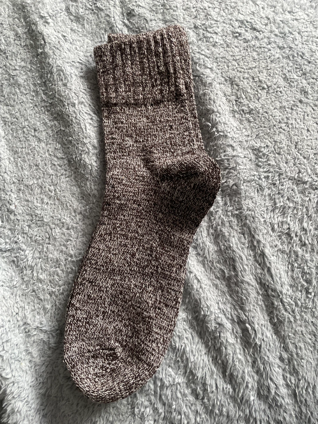 Cozy knit socks in a marled brown and white pattern. Ribbed cuff for a comfortable fit. These socks are great for keeping your feet warm.