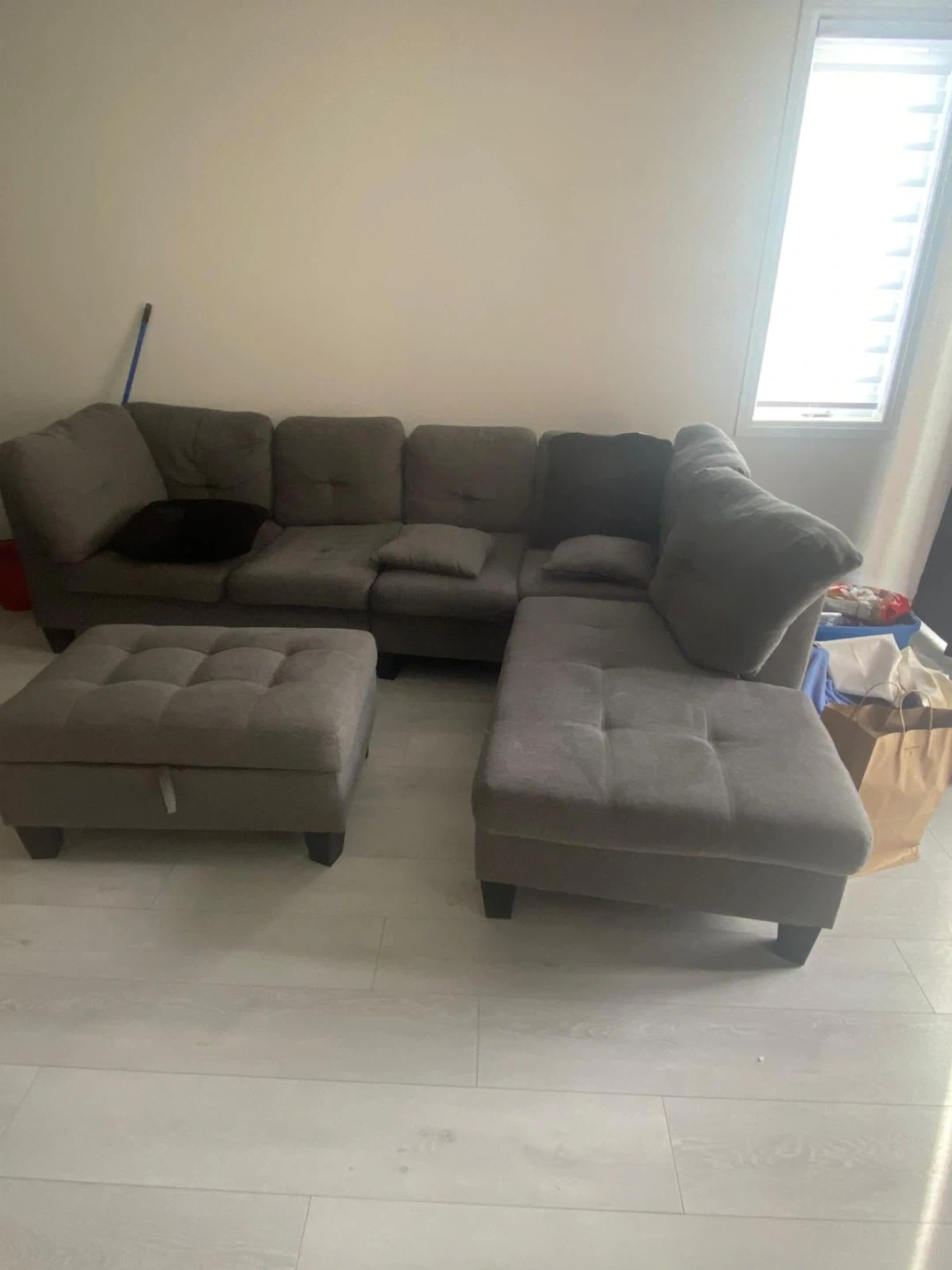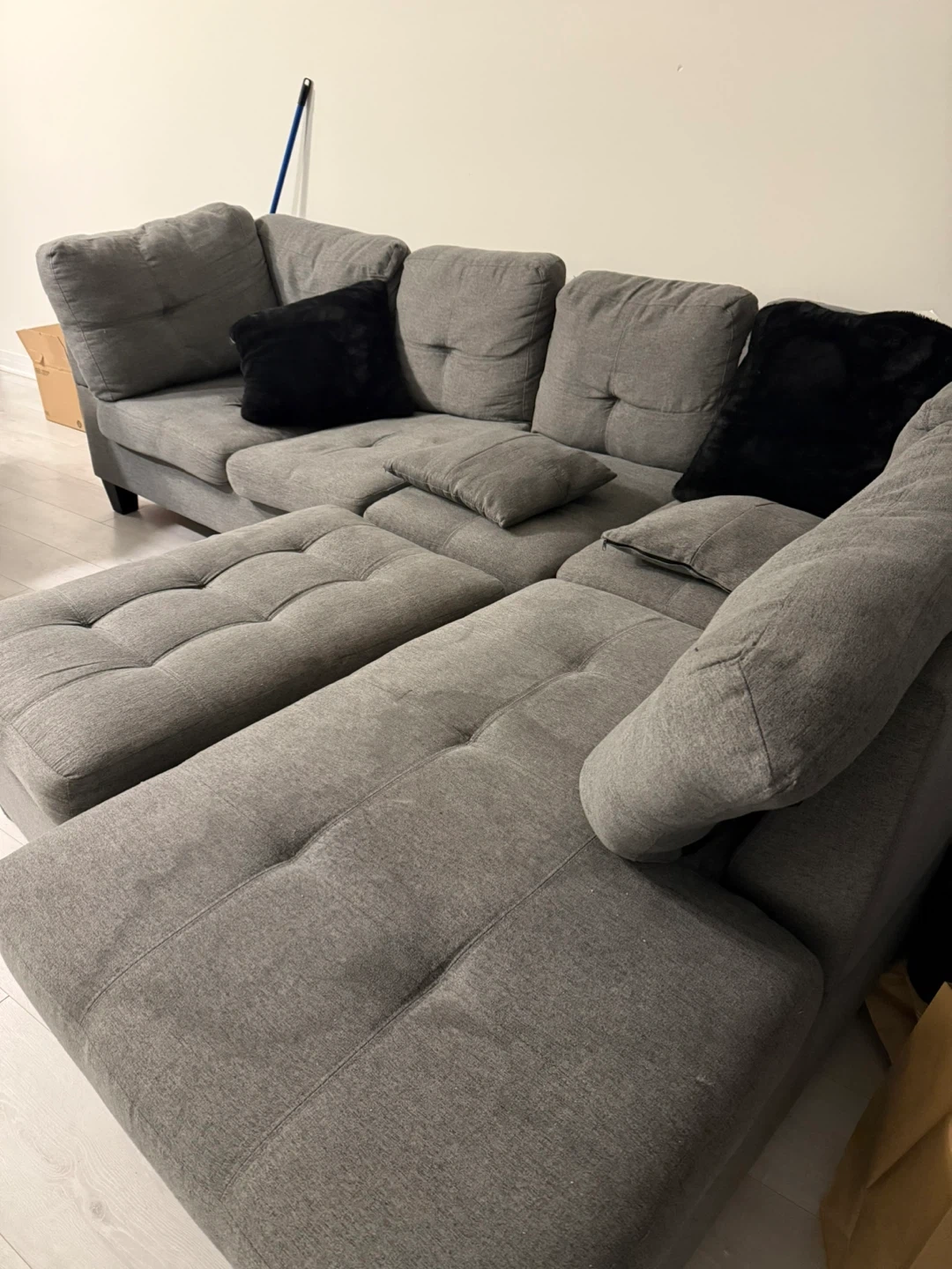 This is a gray sectional sofa. It's upholstered in a textured fabric and features tufted seat cushions.