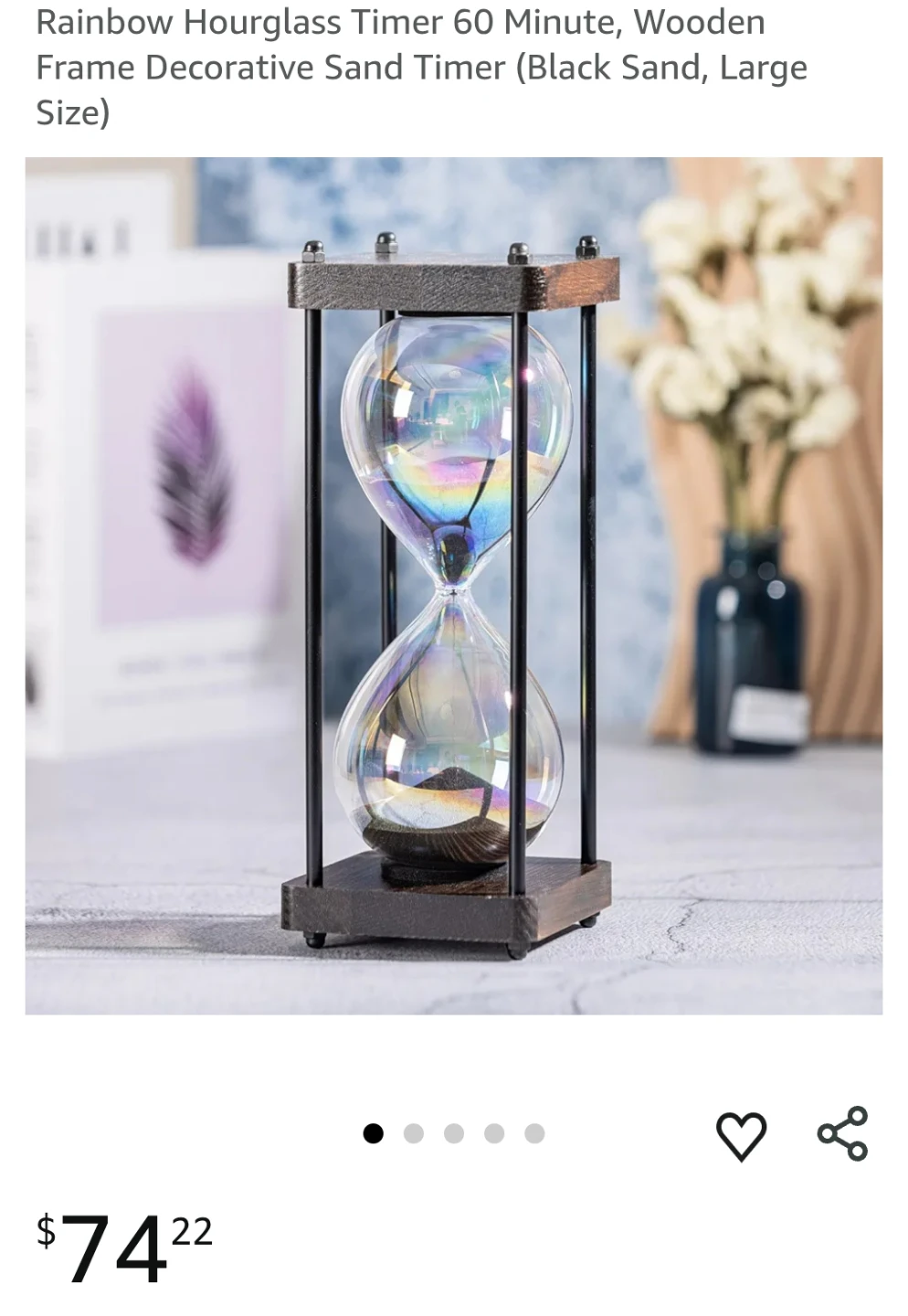 Rainbow hourglass timer with a wooden frame. It's a 60-minute sand timer with black sand. Large size.