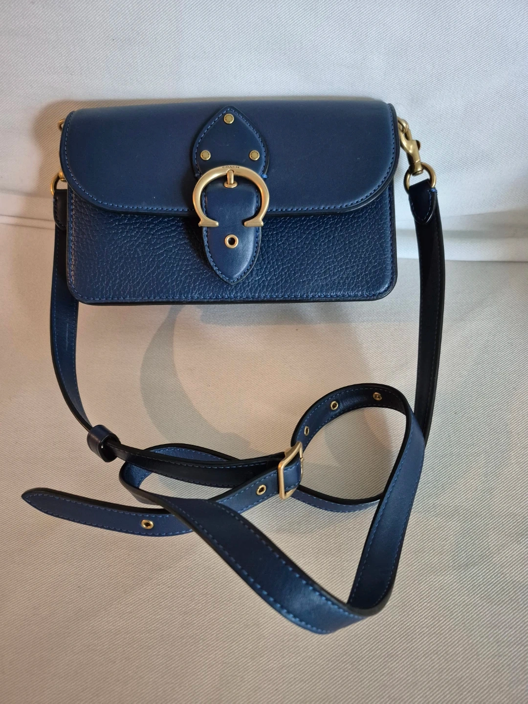 Selling a beautiful Coach Cary shoulder bag in navy blue! This stylish bag is perfect for everyday use and special occasions. The gold-tone hardware adds a touch of elegance. It's in great condition and ready for a new home.