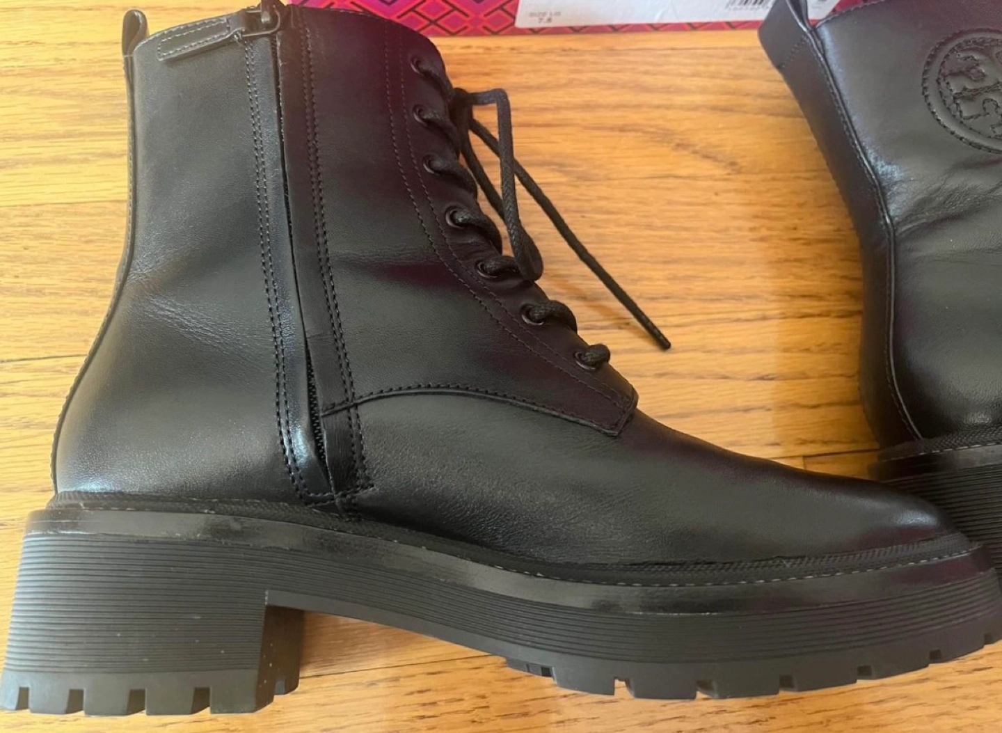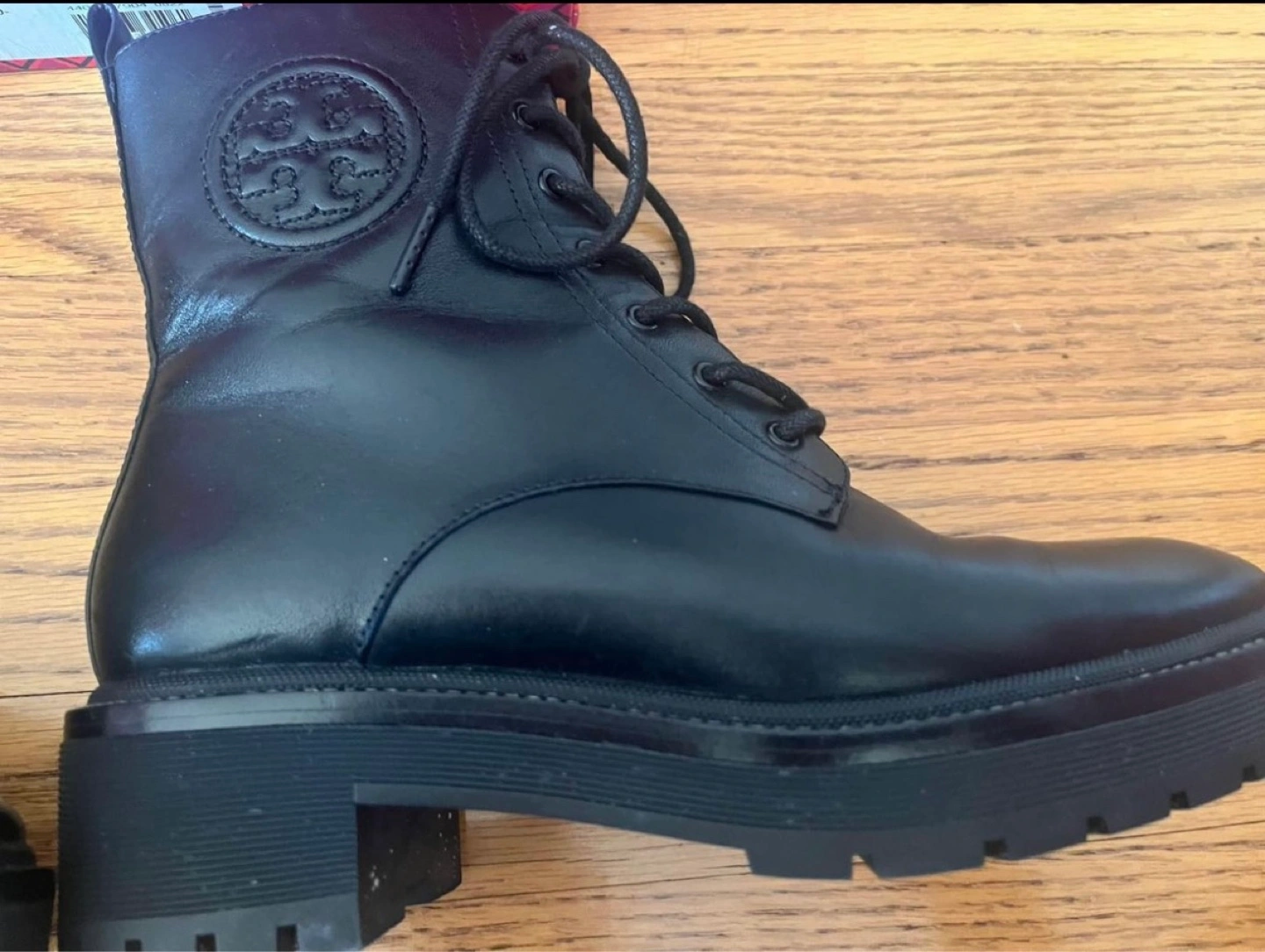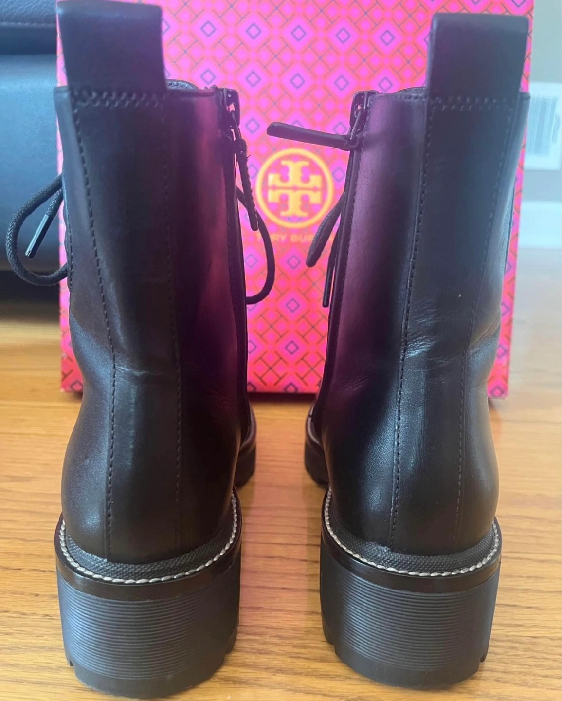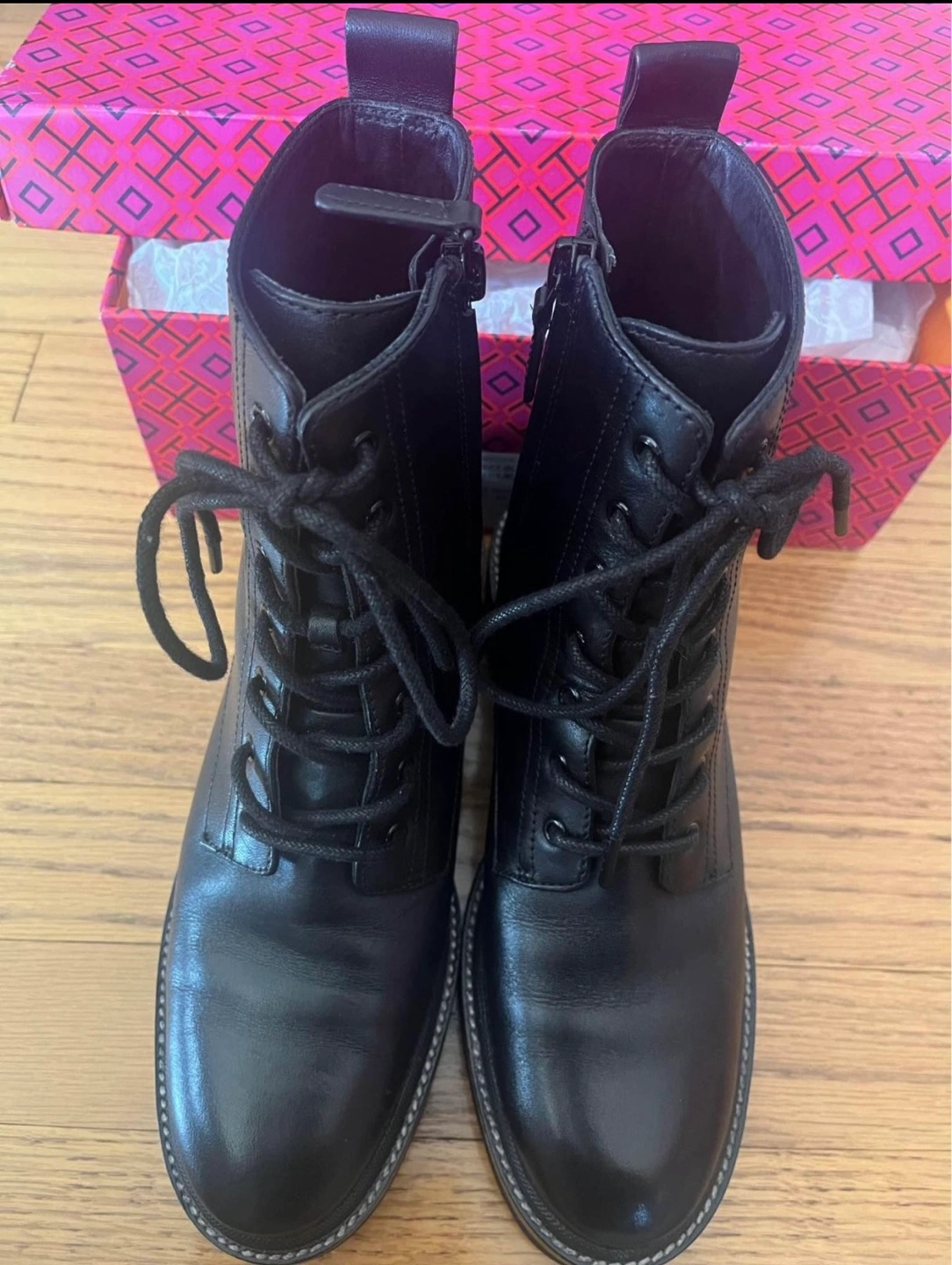Women's black leather combat boots. Lace-up and side zipper closure. Thick platform sole. Like new in box.