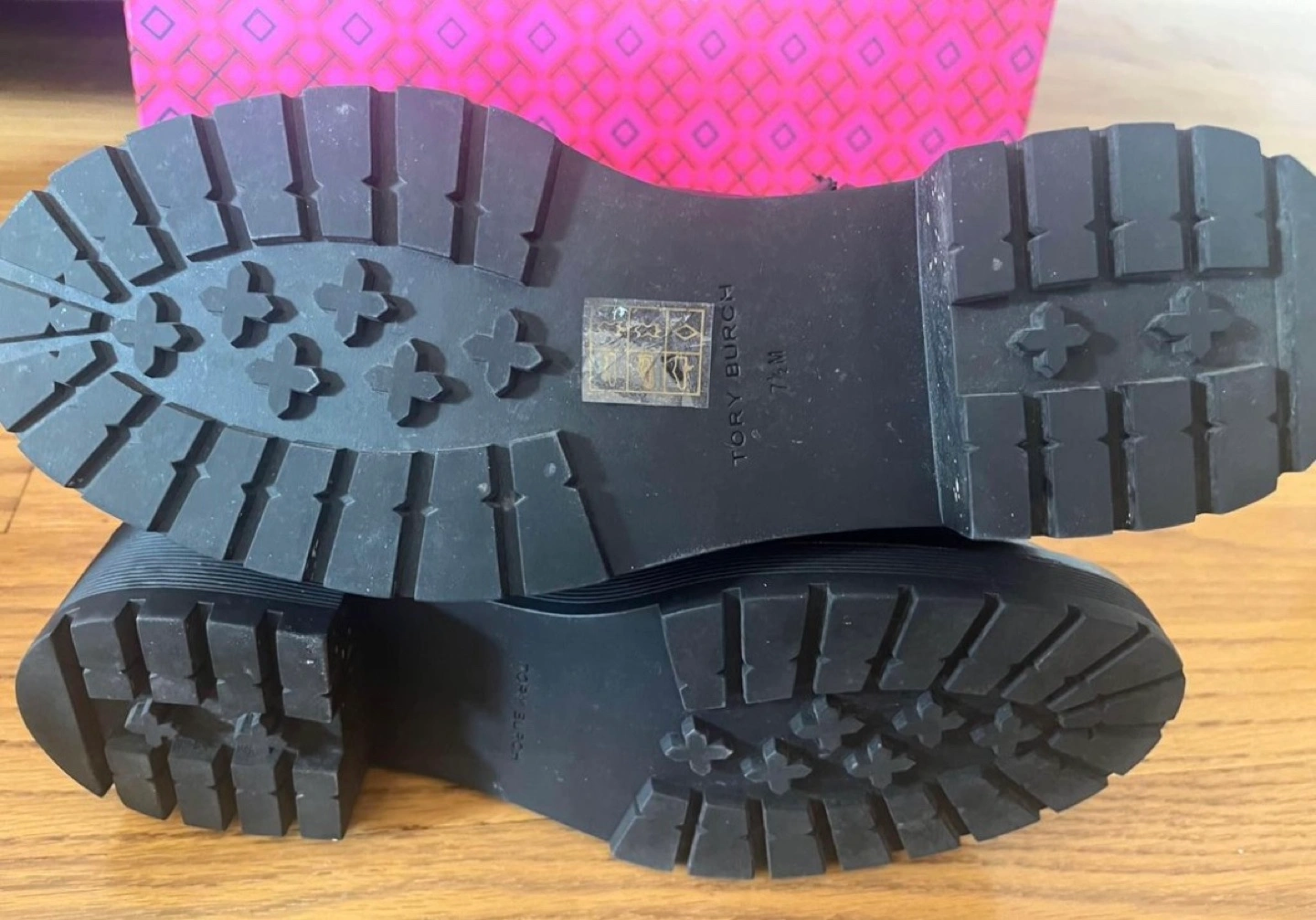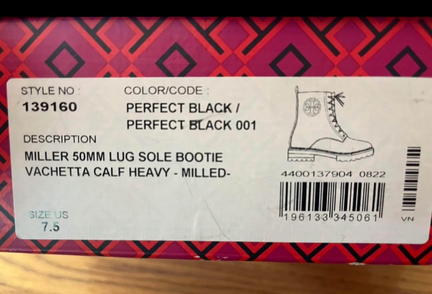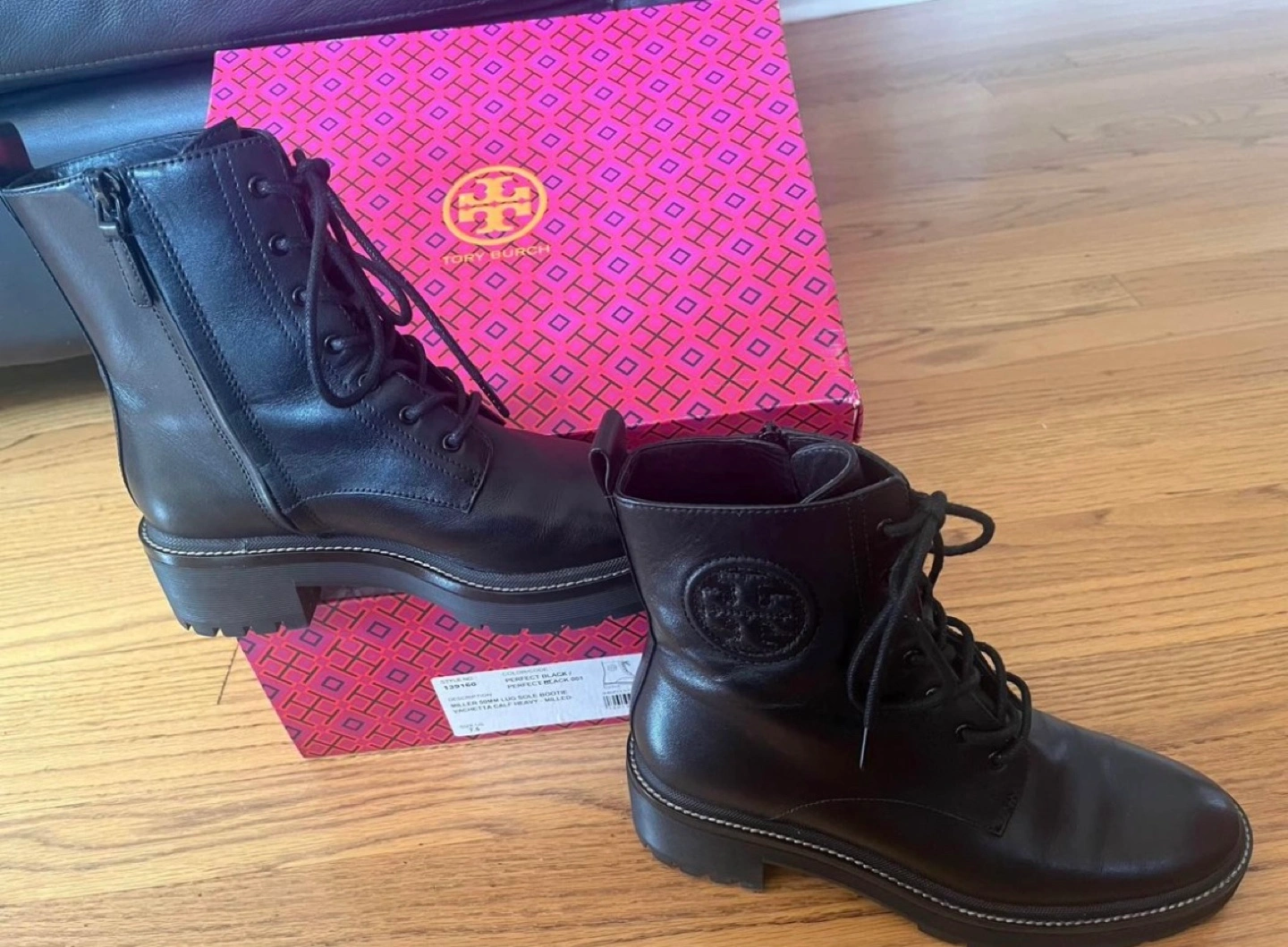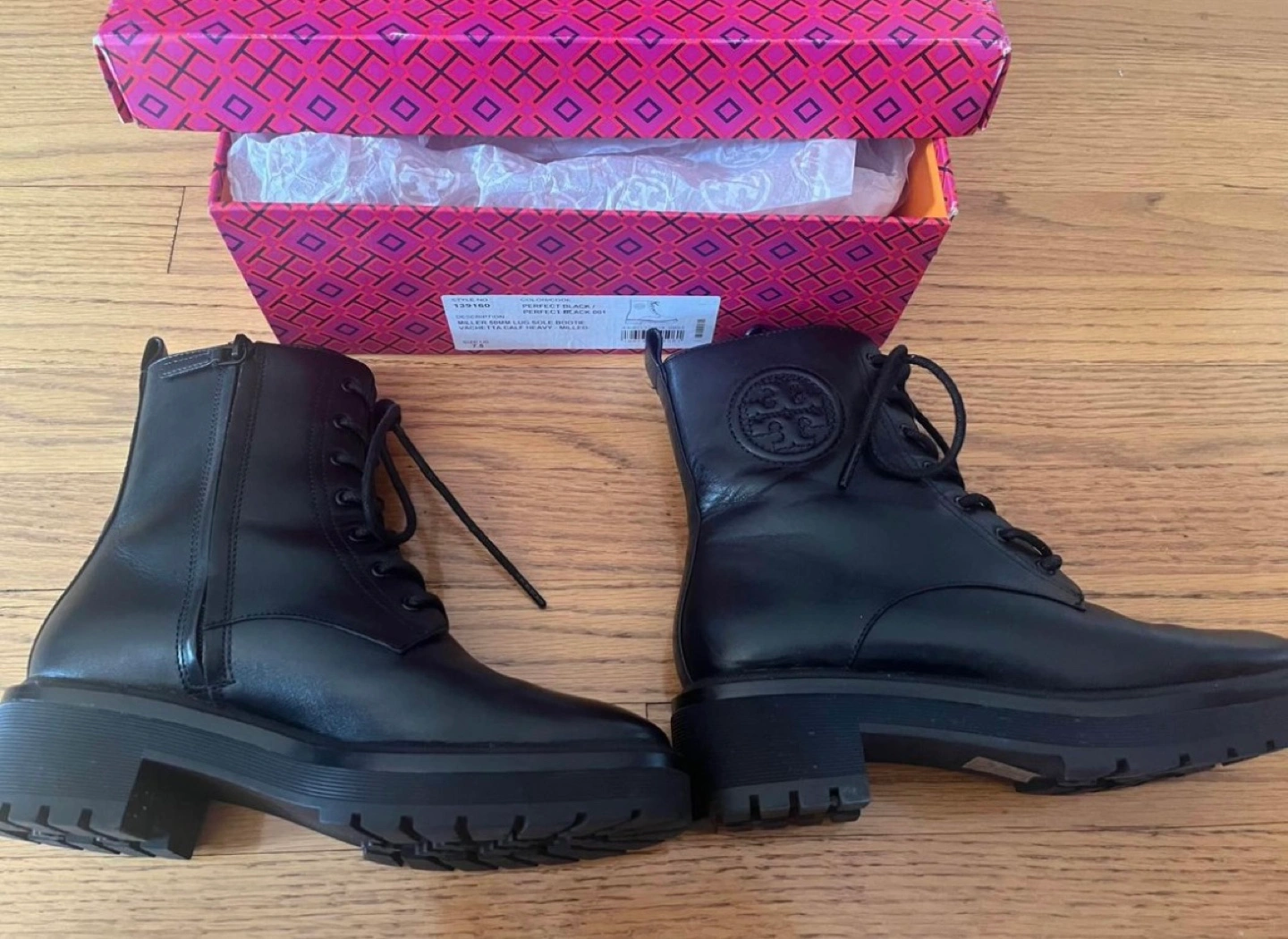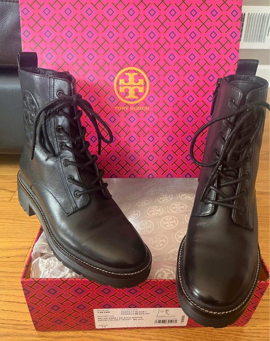 Women's black leather combat boots. Lace-up and side zipper closure. Thick platform sole. Like new in box.