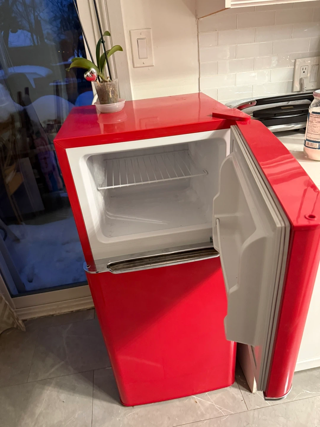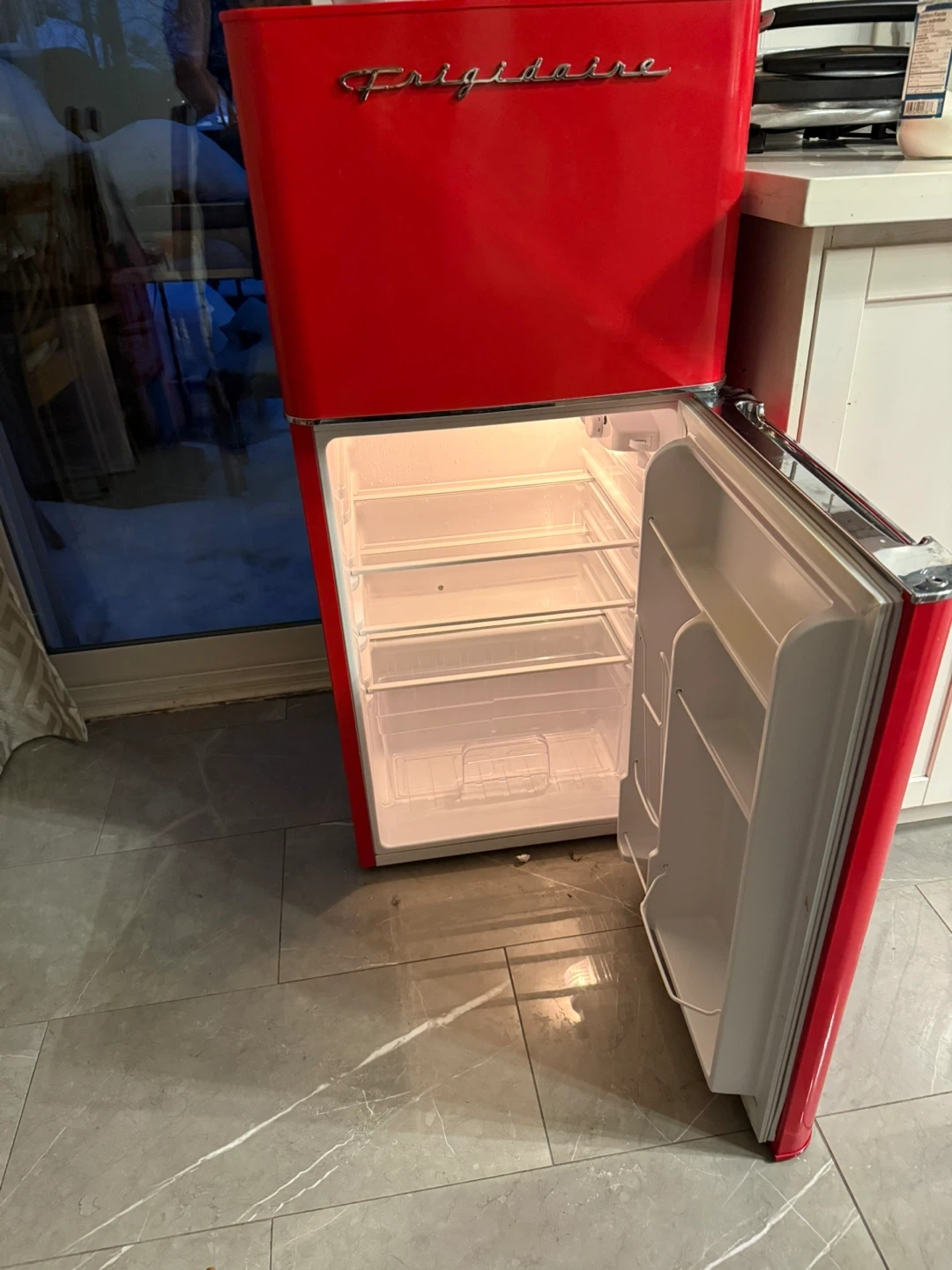 This Frigidaire mini fridge comes in a vibrant red colour with a retro design. It's perfect for a dorm room, office, or small apartment! Interior shelves are adjustable. Measures approximately 35.5 inches high and 19.7 inches wide.