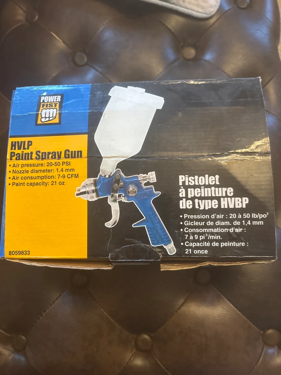 Selling a Power Fist HVLP paint spray gun! It has an air pressure of 20-50 PSI, a nozzle diameter of 1.4 mm, and an air consumption of 7-9 CFM. The paint capacity is 21 oz