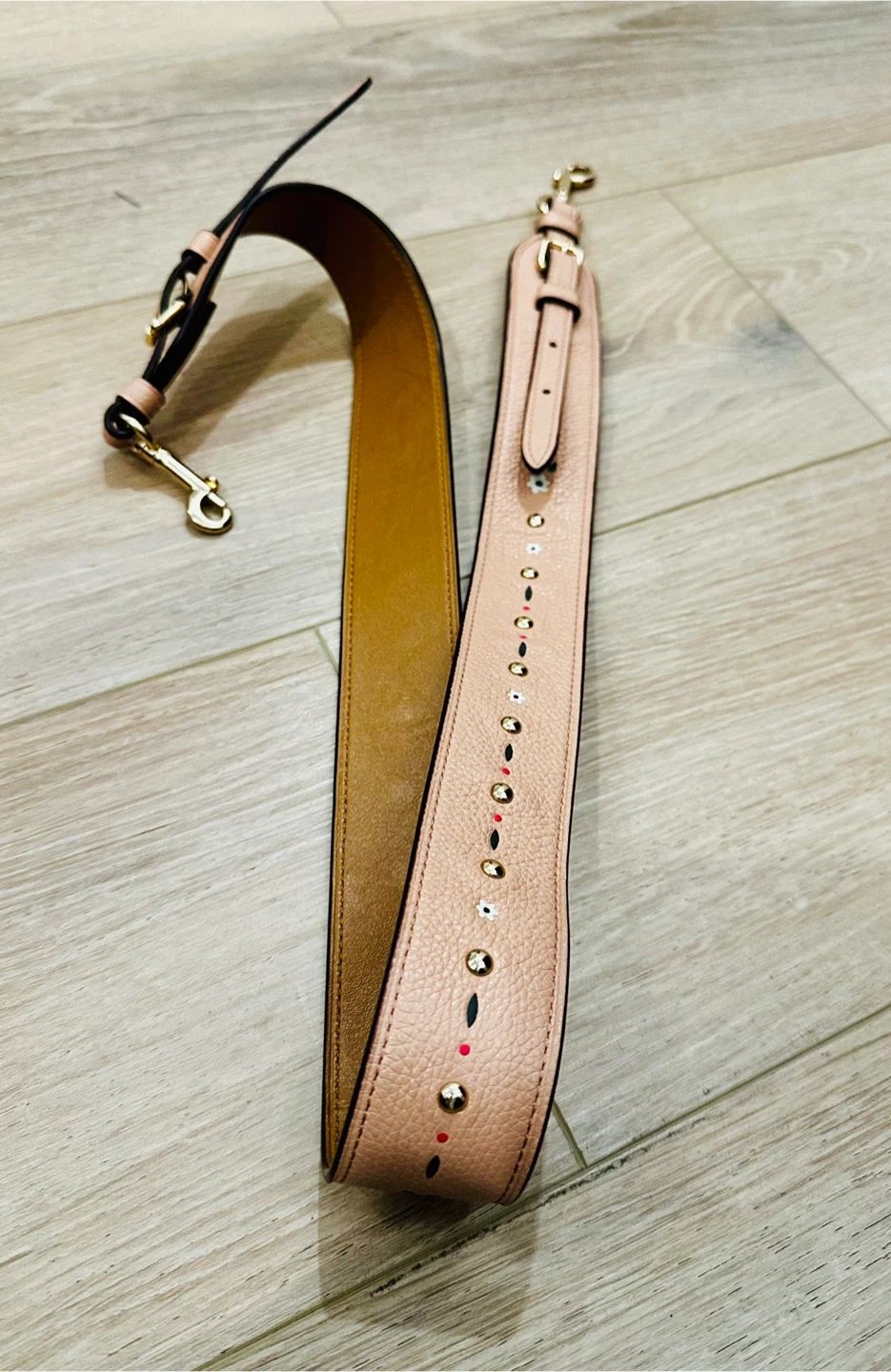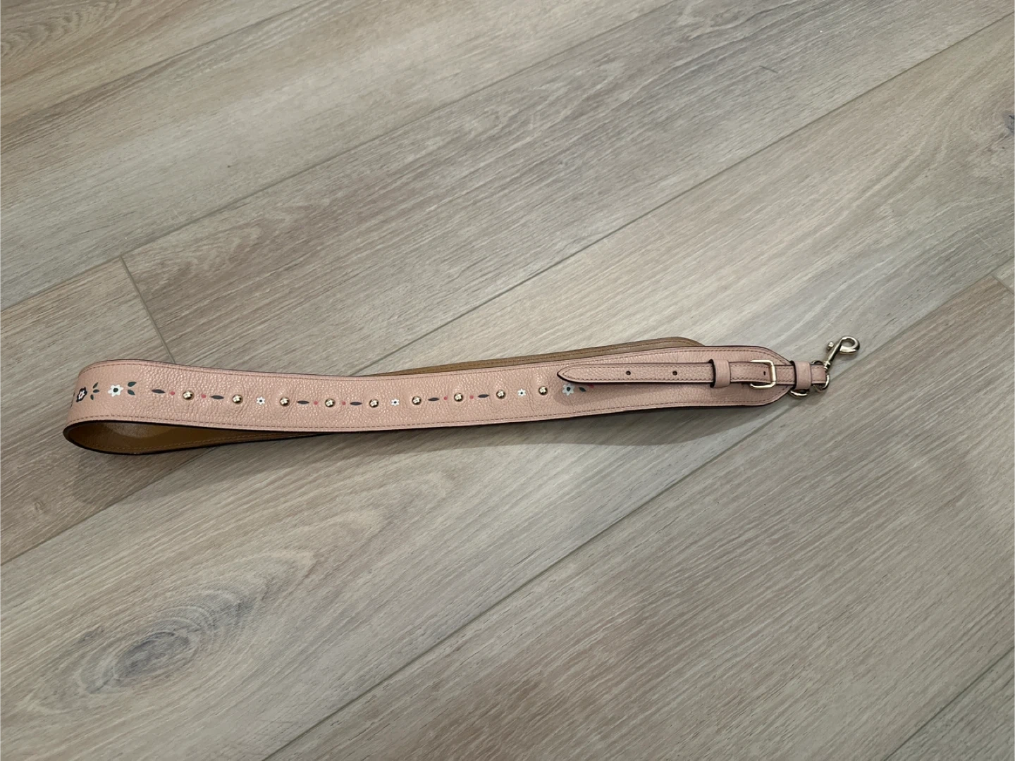 This is a Coach strap made from pink pebbled leather. It features a delicate floral embellishment with gold hardware. The strap is adjustable and has swivel clasps for easy attachment.