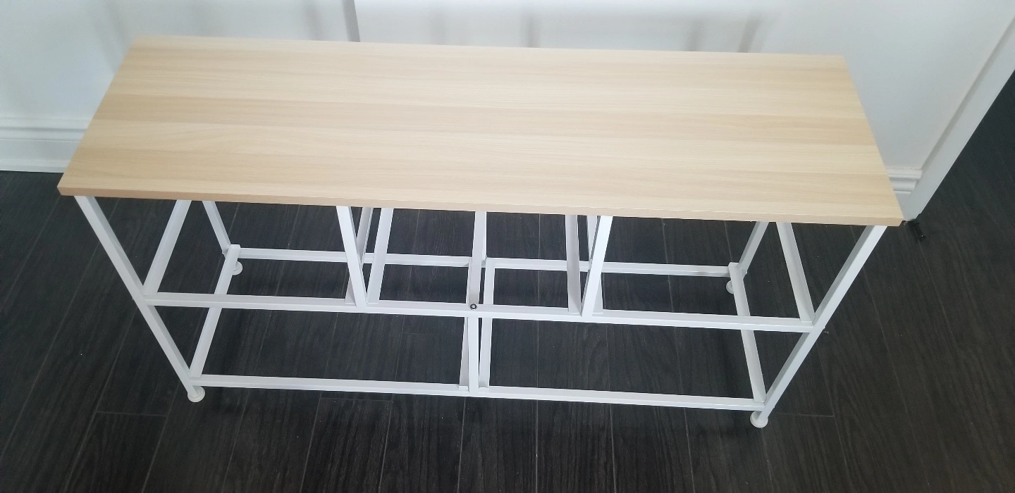 White metal frame with a top wooden table. DRAWERS NOT INCLUDED only table. already Disassembled for easy pick up