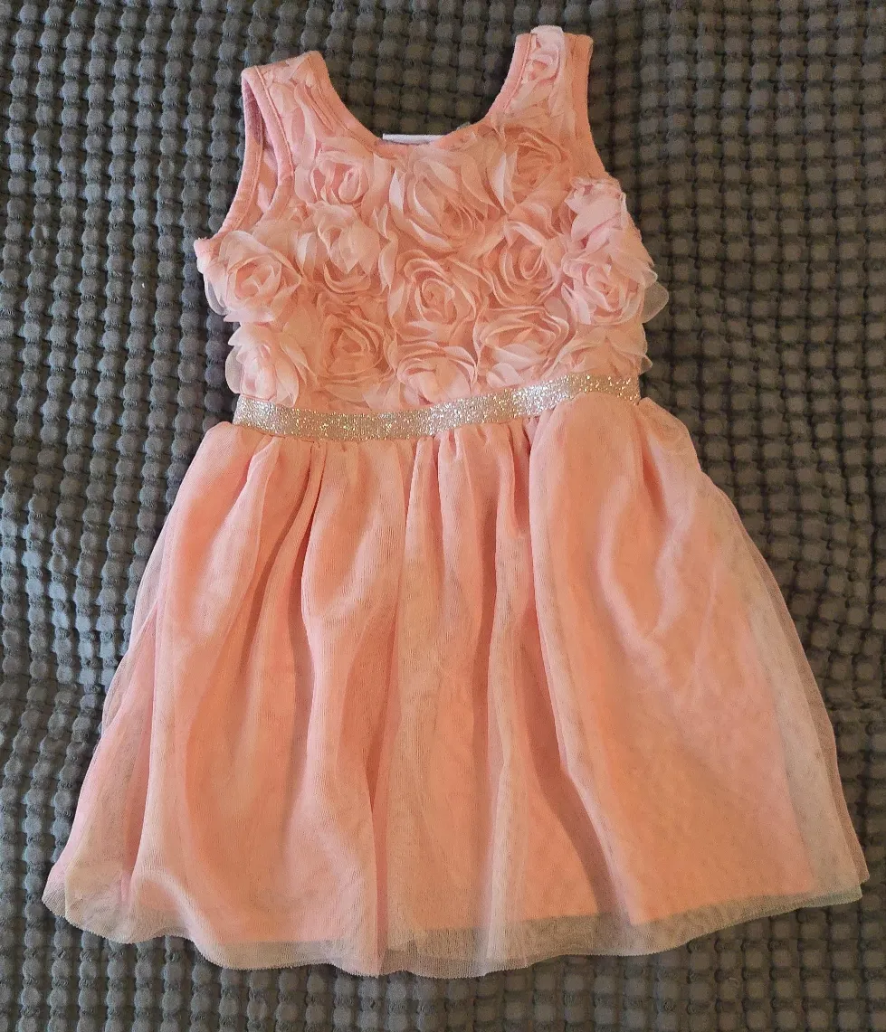 A cute pink dress featuring a lovely floral design on the bodice and a sparkly belt. Perfect for parties or special occasions! excellence used condition , size 5T