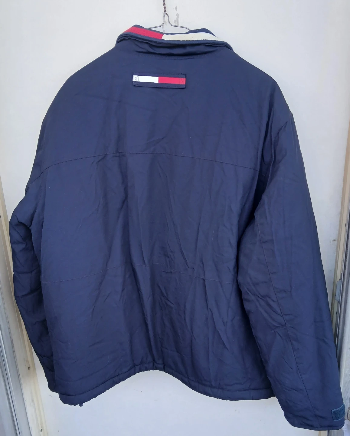 Tommy Hilfiger puffer jacket in navy. It's a size Large with a bright orange lining. Features a full zip closure and two front pockets.