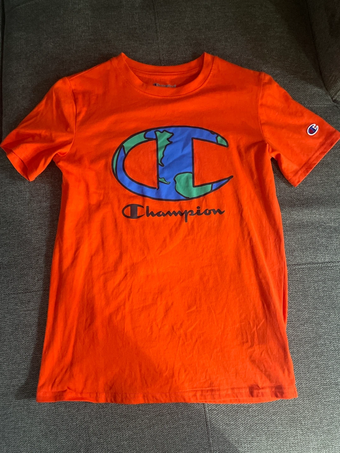 I'm selling a bright orange Champion t-shirt! It has the classic Champion logo on the front. This shirt is in great condition and ready for a new home