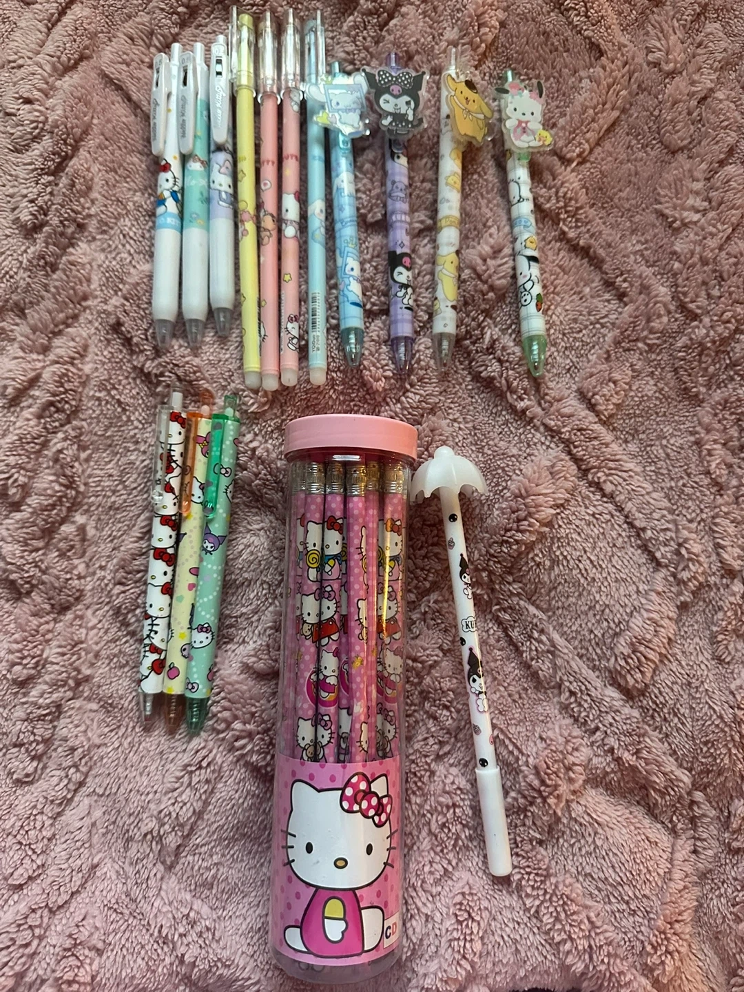 This set includes a container of Hello Kitty pencils and a collection of assorted Sanrio character pens. Great for school or any fan!