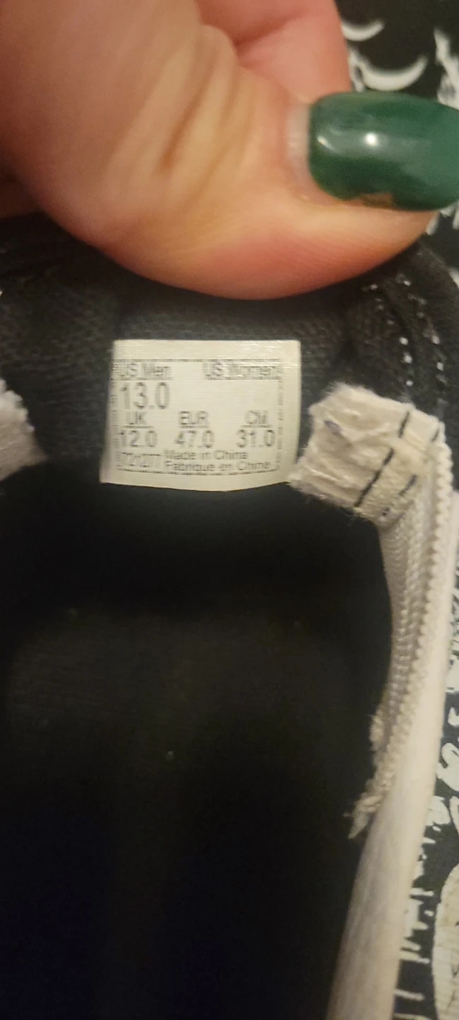 These Vans slip-on shoes feature a unique black and white graphic print. They're a US Men's size 13, which is a UK size 12, a EUR size 47, and a CM size 31. They're made in China.