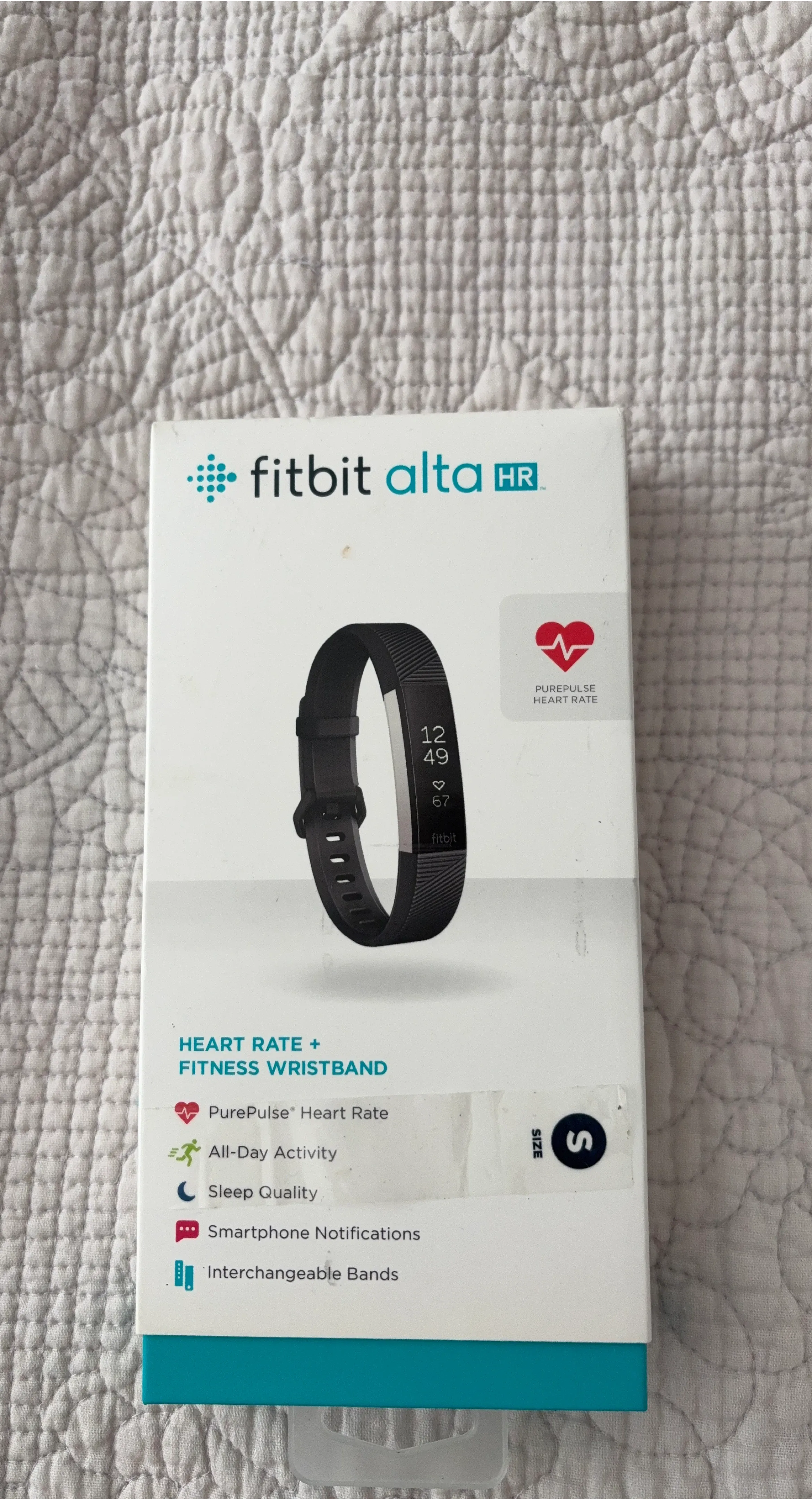 This Fitbit Alta HR is a heart rate and fitness wristband. It tracks PurePulse heart rate, all-day activity, and sleep quality. It also provides smartphone notifications and has interchangeable bands. It's a size small.
