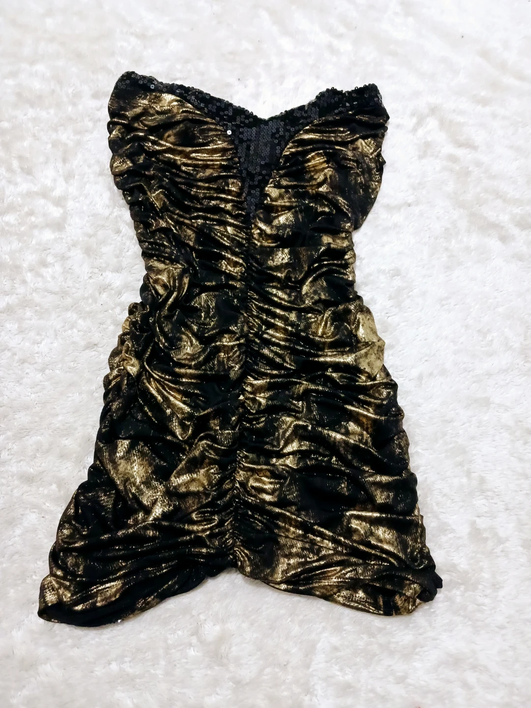 Selling a cute gold and black party dress! It's perfect for a night out or a special occasion. The dress features a strapless design with ruching throughout, adding a touch of elegance and style. The combination of gold and black creates a stunning and eye-catching look !