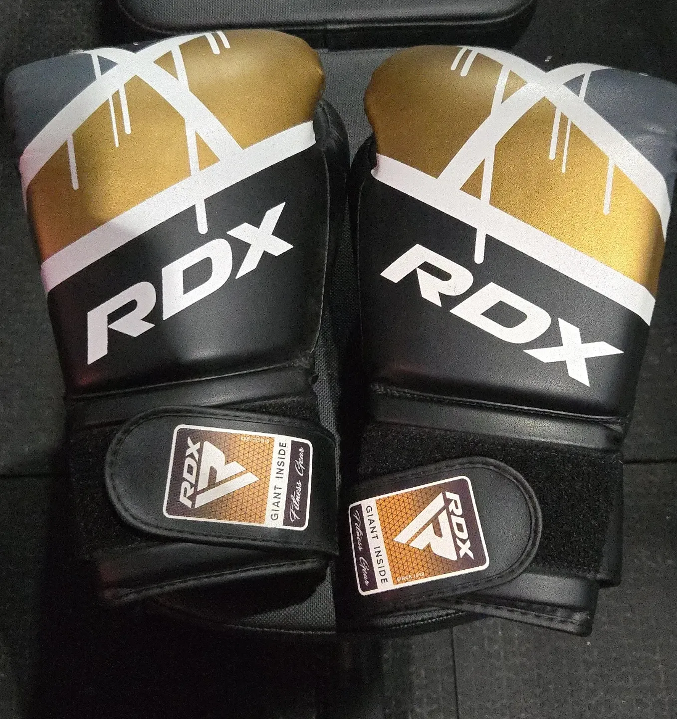RDX boxing gloves designed for fitness gear. These gloves feature a black, gold, and grey design with adjustable velcro straps for a secure fit. They're built for training and sparring. 14OZ