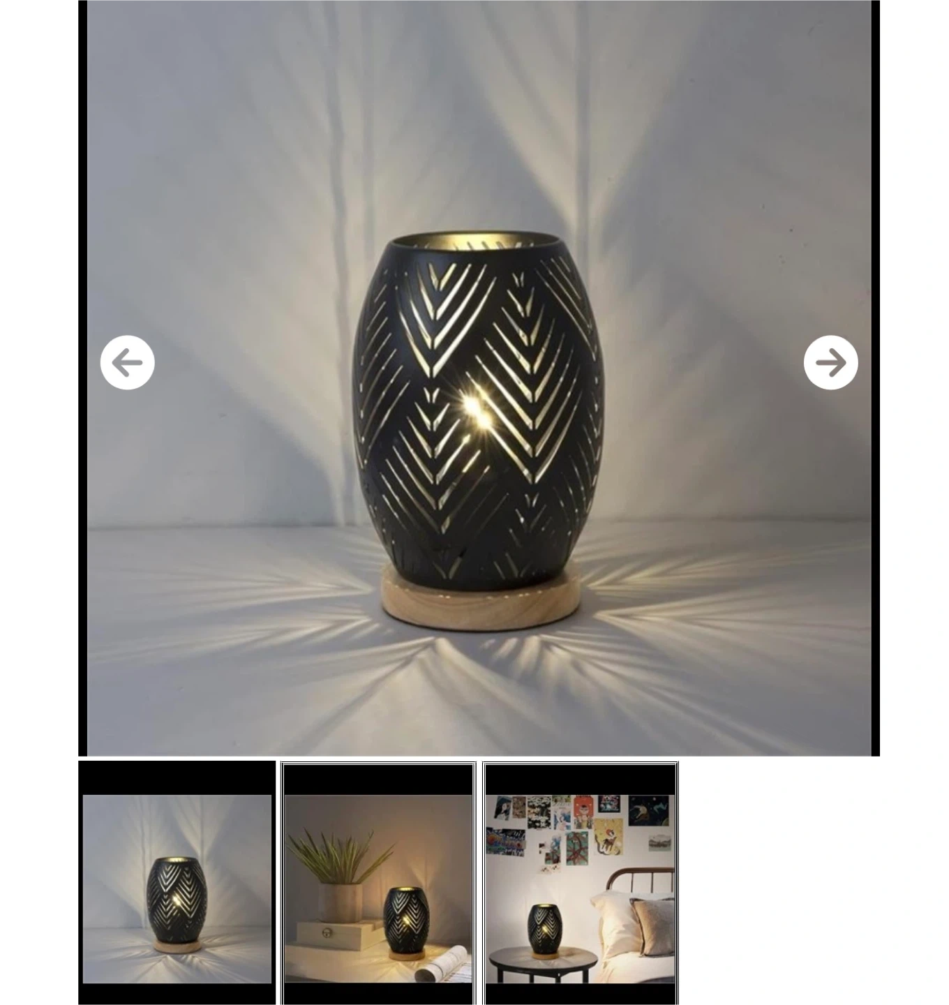This decorative lantern lamp features a black metal design with cut-out patterns. It sits on a natural wood base and casts intricate shadows when lit. It's perfect for creating ambient lighting in any room.
