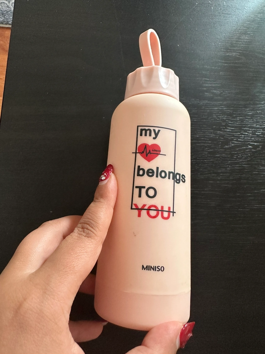 Pink water bottle with a heart and a black and white graphic that says "My heart belongs to you". It has a loop for carrying.