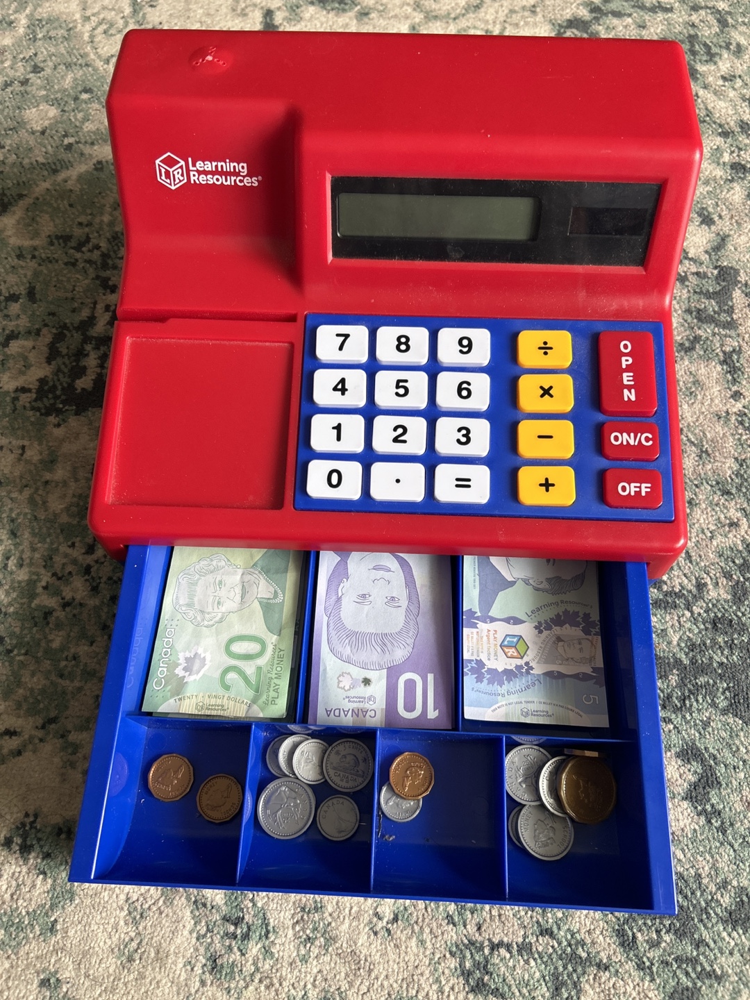 Red and blue plastic toy cash register. Features calculator, a small drawer, and a display screen. Includes pretend Canadian money.