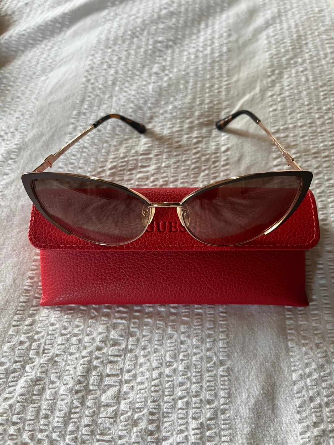 Cat-eye style Guess sunglasses in gold and tortoiseshell. Gradient brown lenses. Comes with a red faux-leather case. Model number GU7744 visible on inner arm.