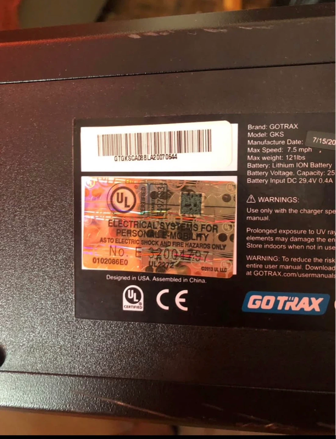 GOTRAX GKS electric scooter. Max speed: 7.5 mph. Battery: Lithium (ON Battery). Battery voltage input: 29.4V 0.4A.