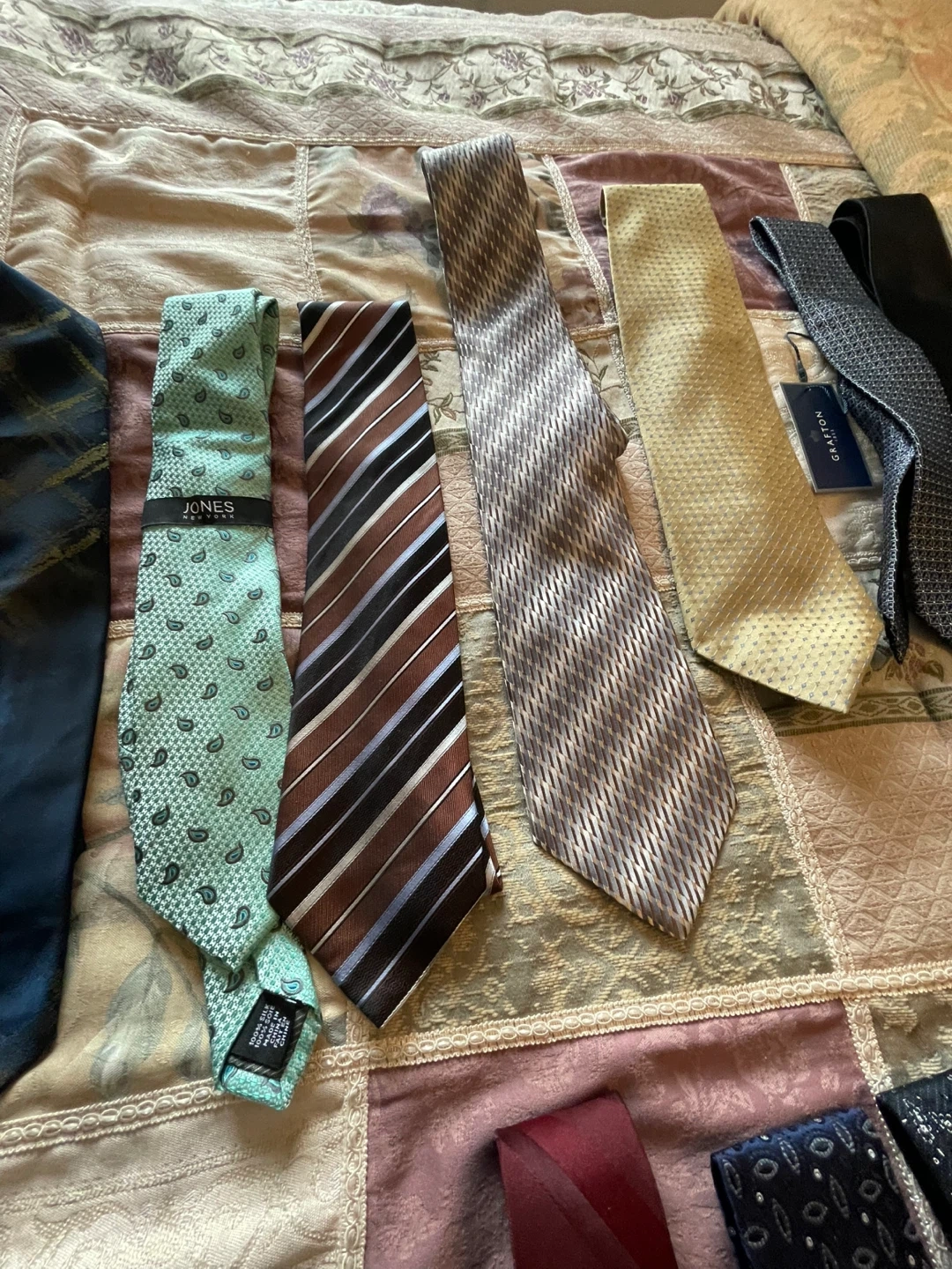 A collection of various men's neck ties with different patterns and colours. Features brands like Jones New York and Grafton. Materials include silk and polyester blends most never been used or only worn 1 time don’t wear ties anymore looking for a new home have 34 ties $20 dollars each there’s no size cash only please no e-transfers thank you