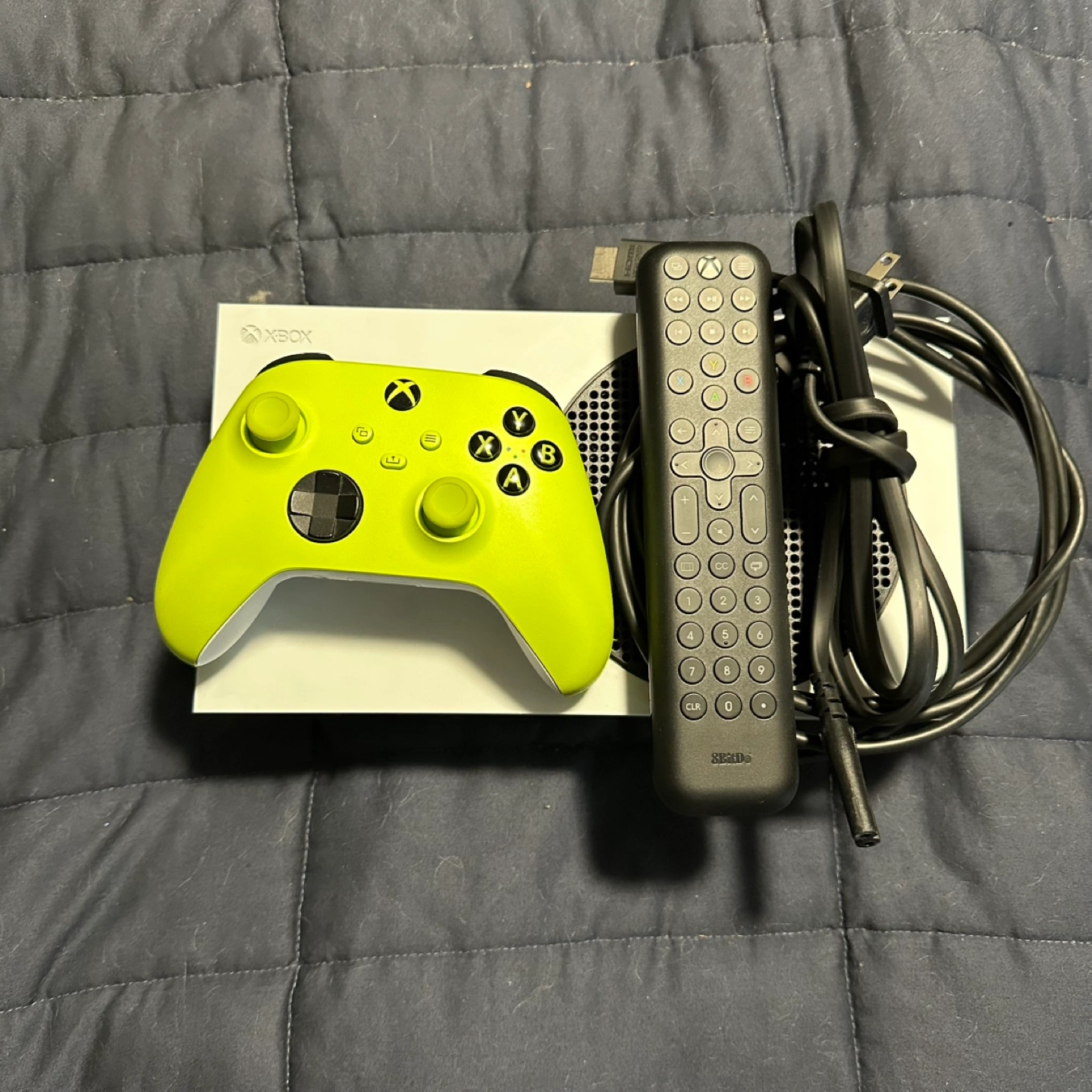 Xbox Series S in good working condition. The controller is in good working condition, some cosmetic marks on the thumbsticks as you can see in the photos. Includes power cable, HDMI cable, controller, and bluetooth remote.