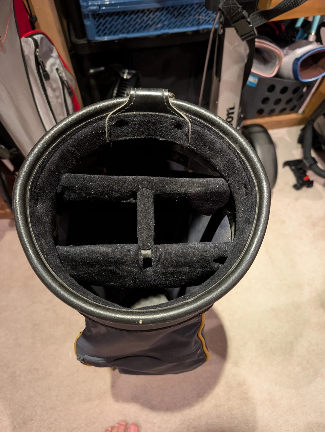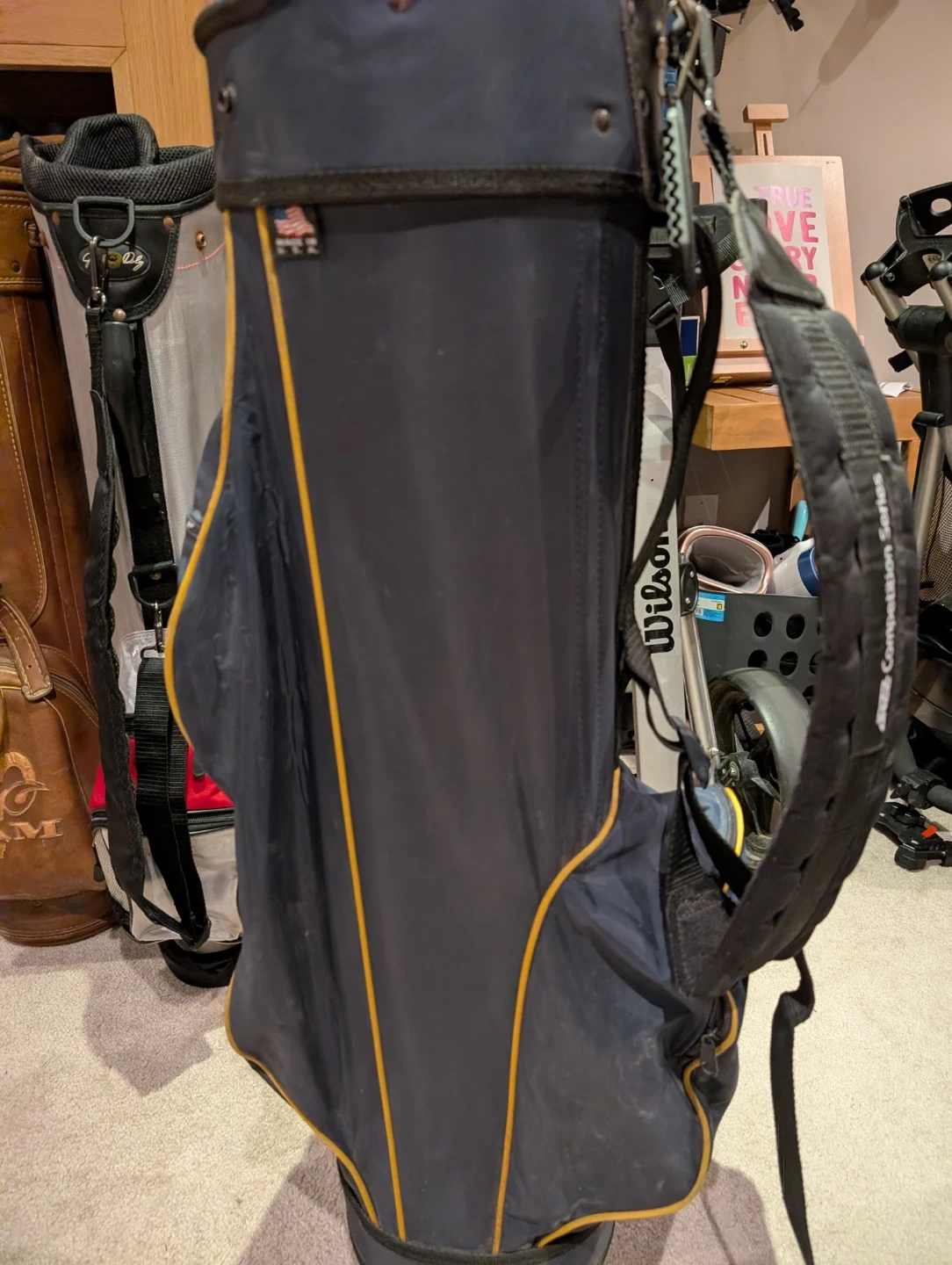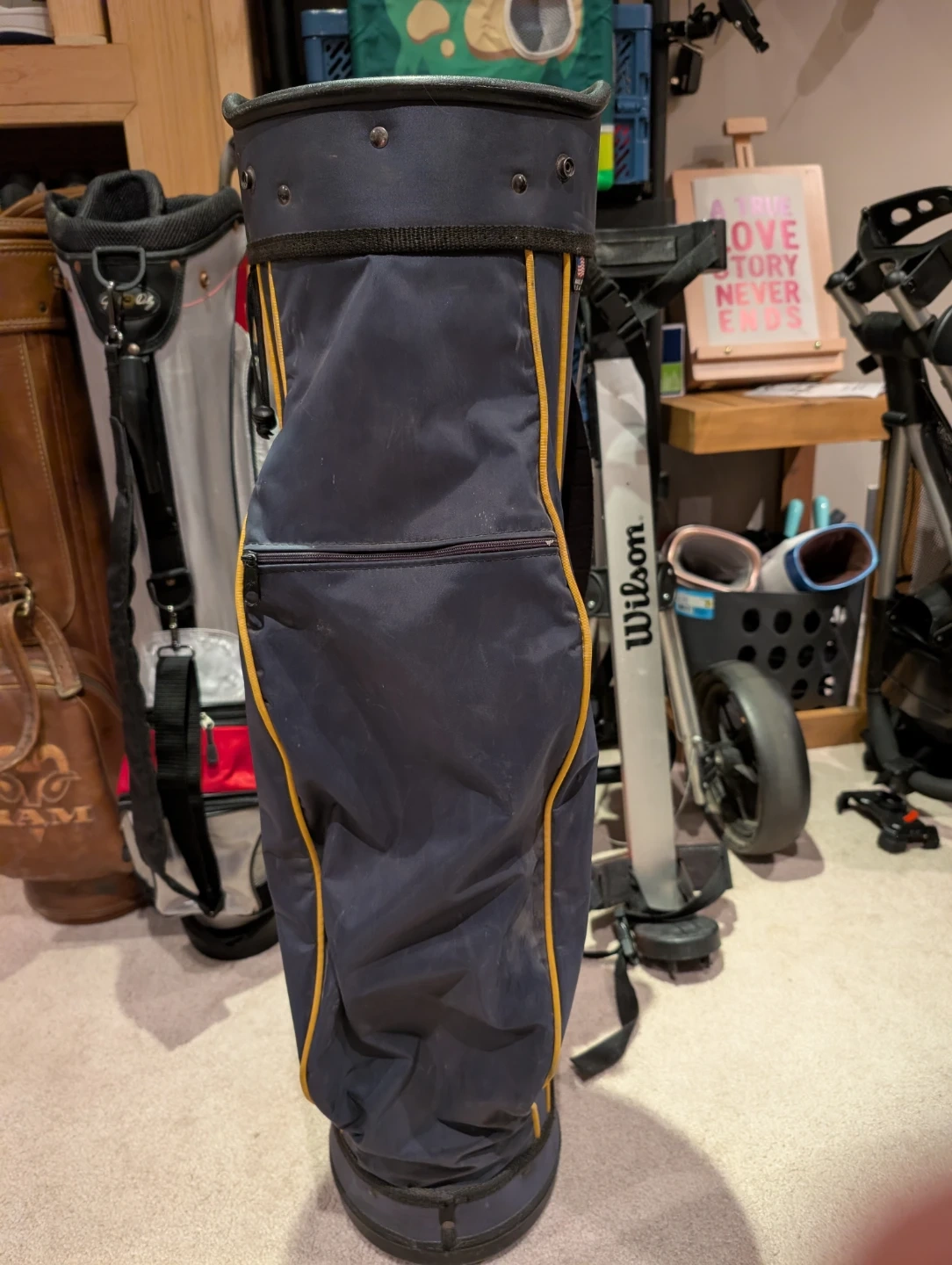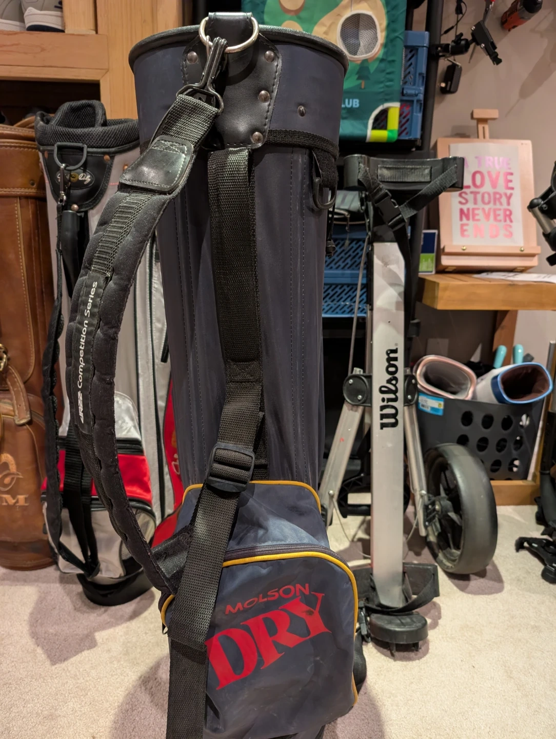 Navy blue golf bag with yellow trim and Molson Dry branding. Features multiple compartments for clubs and accessories. Comes with a shoulder strap. All Zippers work