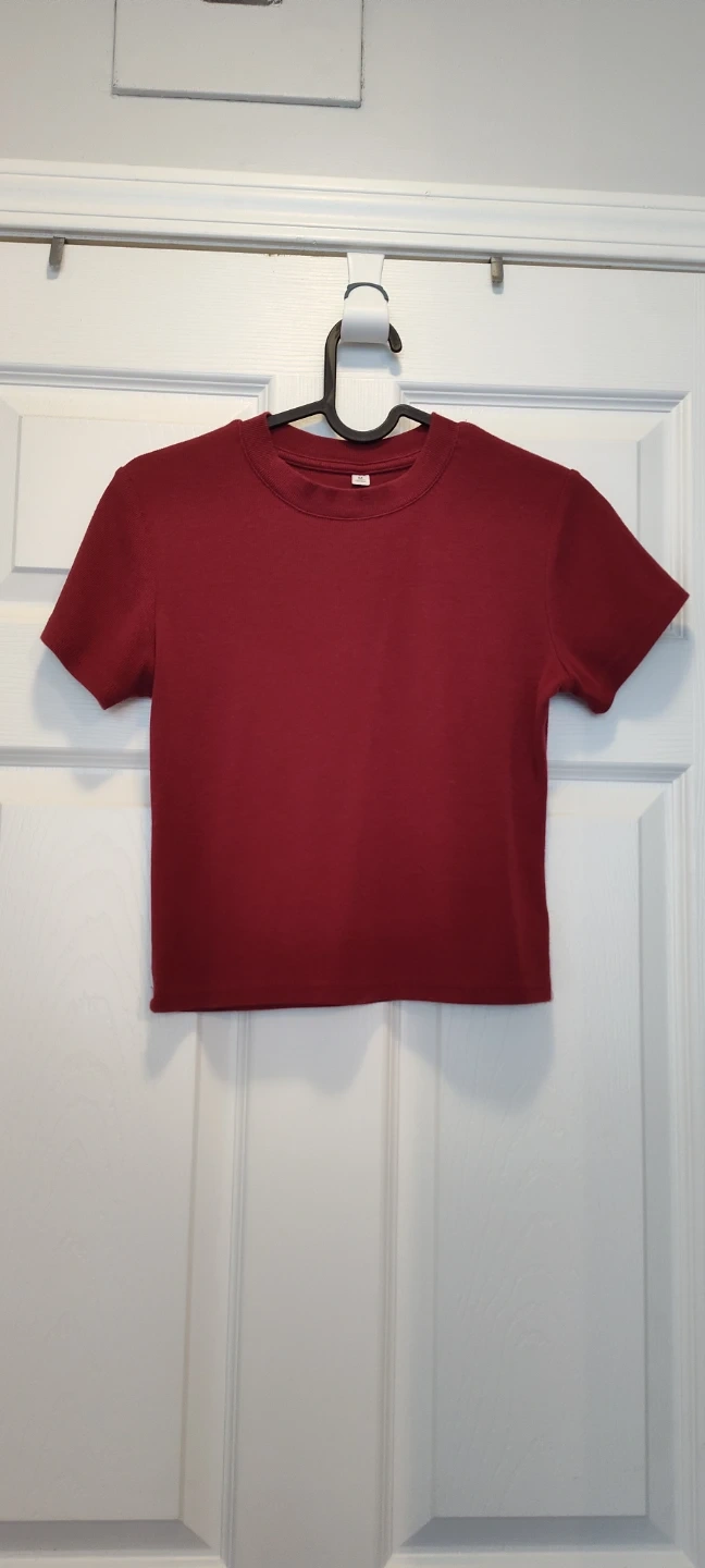 This maroon cropped t-shirt is made of a soft cotton blend. It's a size small with short sleeves and a classic crew neck. A simple staple for any casual outfit!