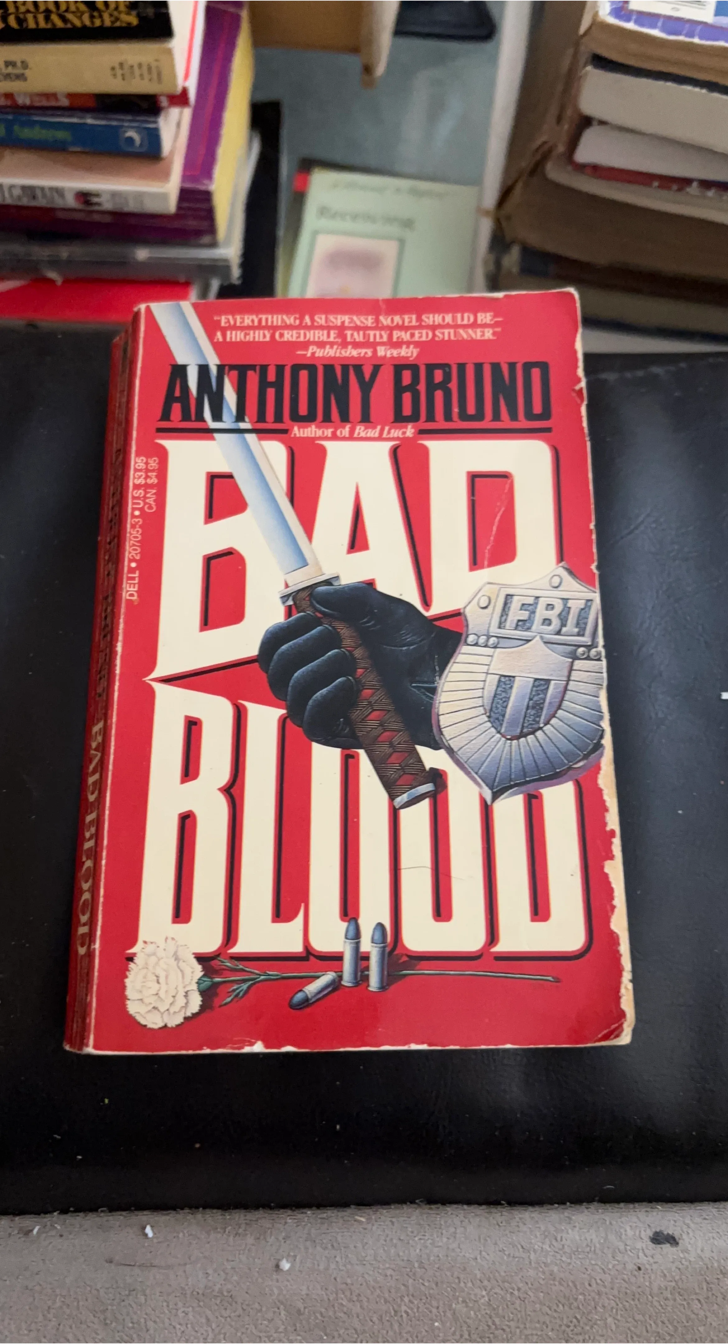 This is the paperback novel "Bad Blood" by Anthony Bruno. It's a suspense novel written by the author of Bad Luck. The book features a thrilling plot and is a Publishers Weekly pick!