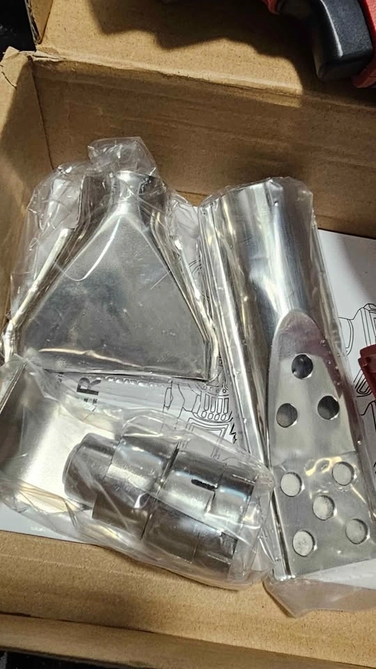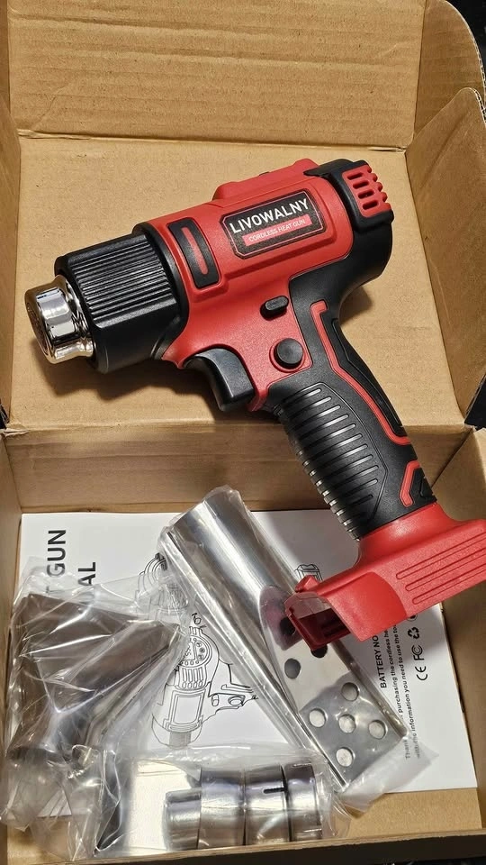 LIVOWALNY cordless heat gun. Comes with multiple nozzles for different jobs. Super fast heat up, like 2-3 seconds! Has two temperature settings, a safety lock, and an LED light. The handle is comfortable and anti-slip. Battery not included, but it works with Milwaukee 18V lithium-ion batteries. A 4.0ah+ battery is recommended for best use. It's super lightweight and portable. Used one time, like new.