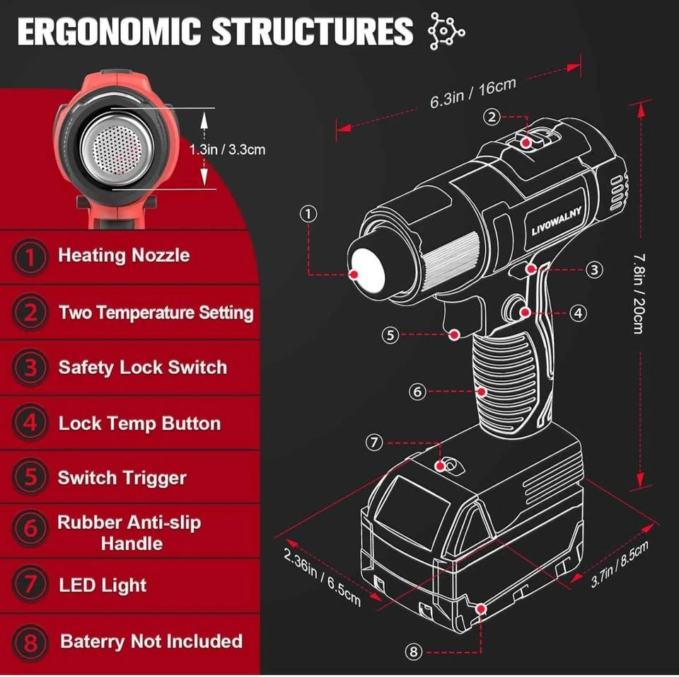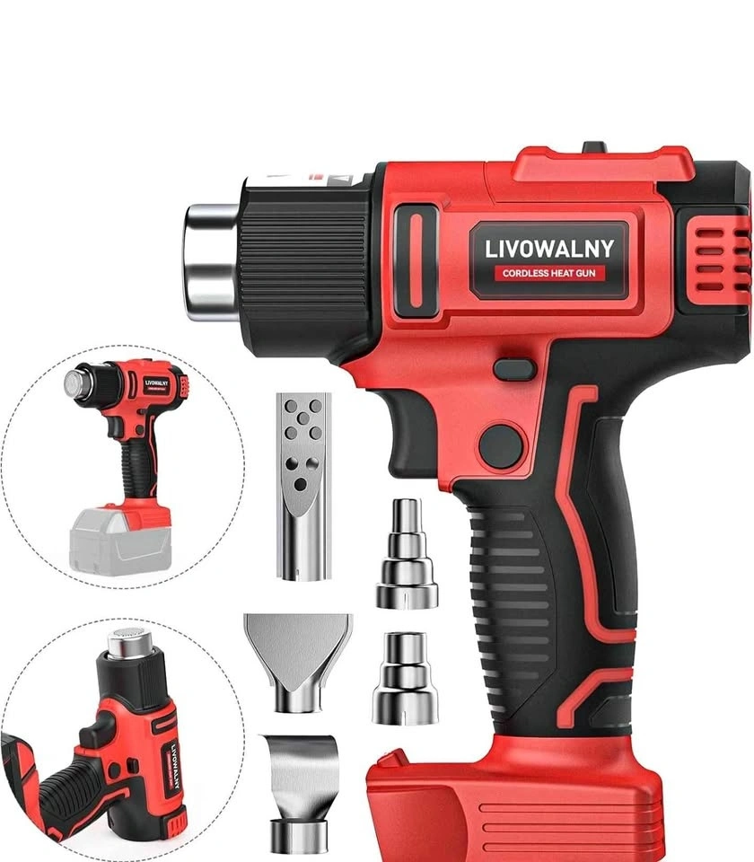 LIVOWALNY cordless heat gun. Comes with multiple nozzles for different jobs. Super fast heat up, like 2-3 seconds! Has two temperature settings, a safety lock, and an LED light. The handle is comfortable and anti-slip. Battery not included, but it works with Milwaukee 18V lithium-ion batteries. A 4.0ah+ battery is recommended for best use. It's super lightweight and portable. Used one time, like new.