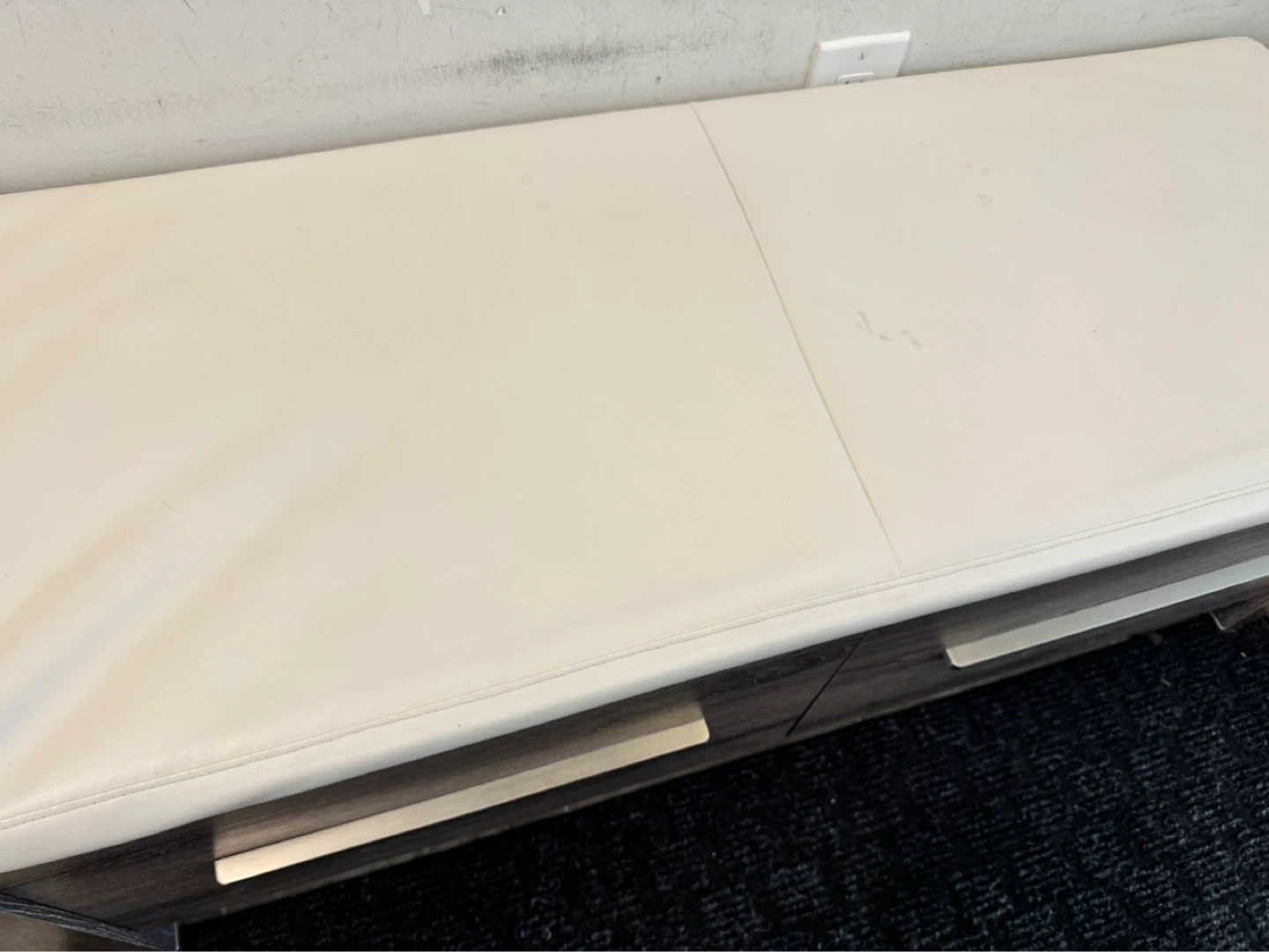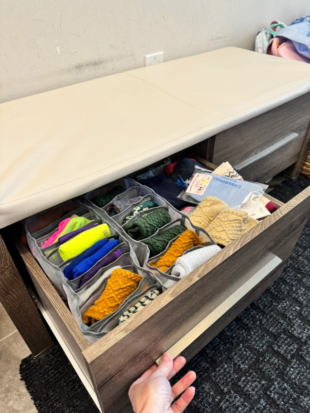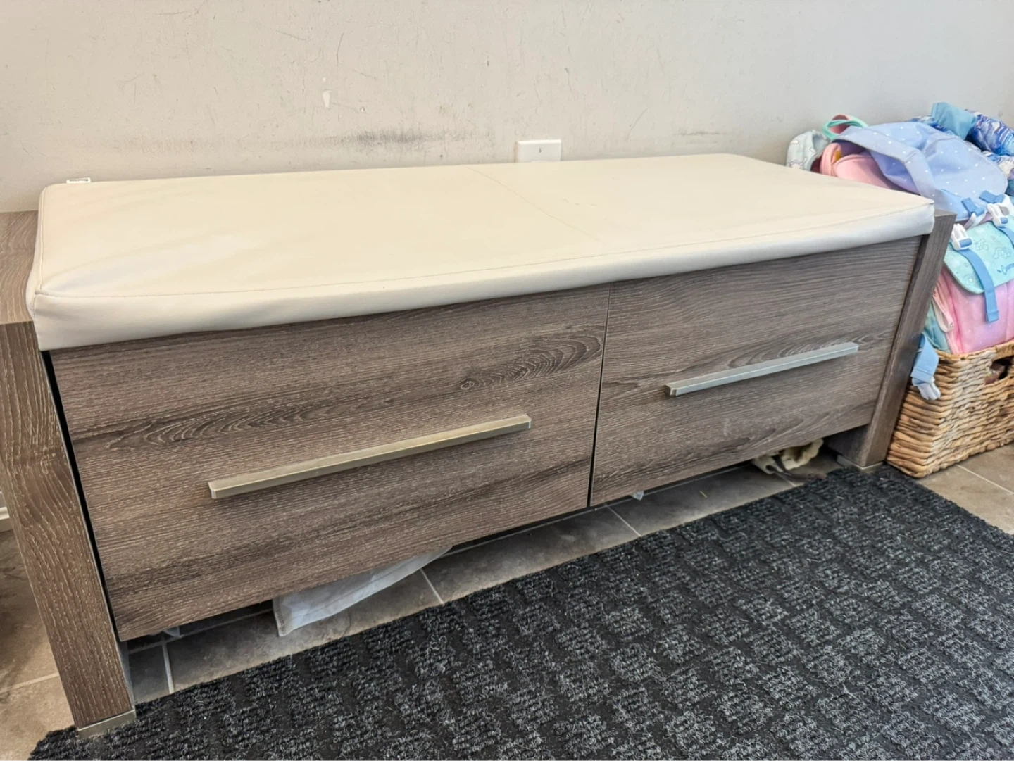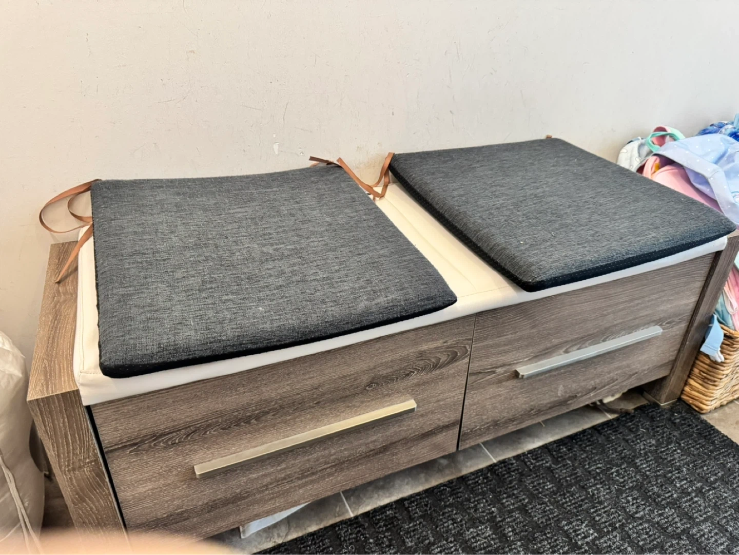 Wooden storage bench featuring two drawers and a cushioned top for seating. Includes fabric drawer organizers. Great for entryway or bedroom storage!