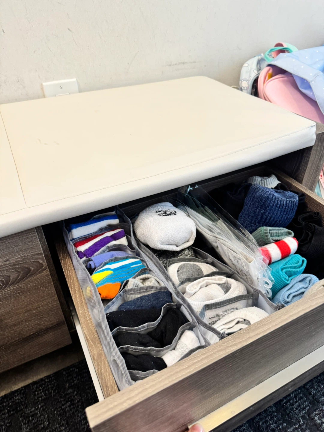Wooden storage bench featuring two drawers and a cushioned top for seating. Includes fabric drawer organizers. Great for entryway or bedroom storage!