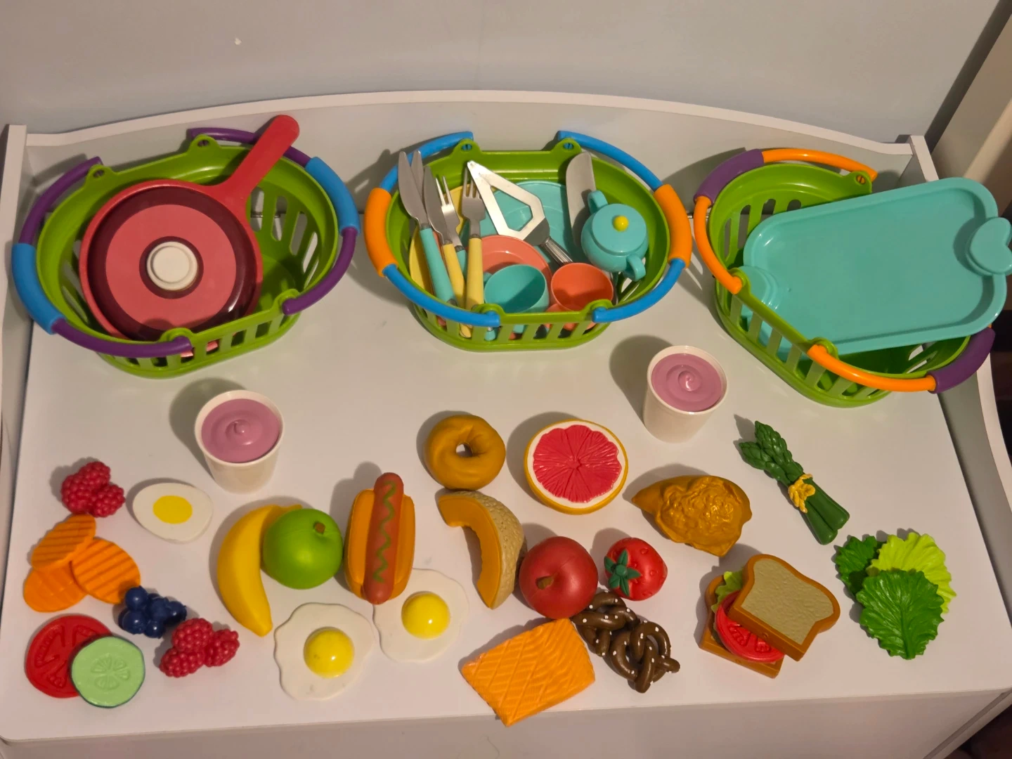 This is a fun toy kitchen set for kids. It comes with three colourful baskets, play food items, and cooking accessories.