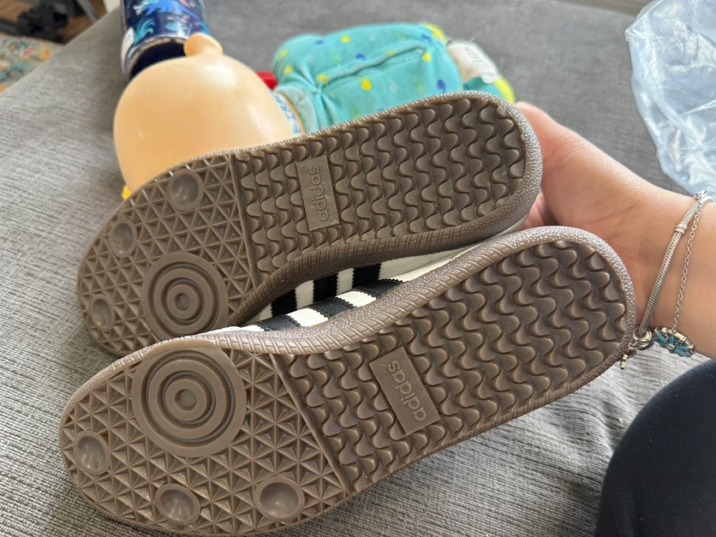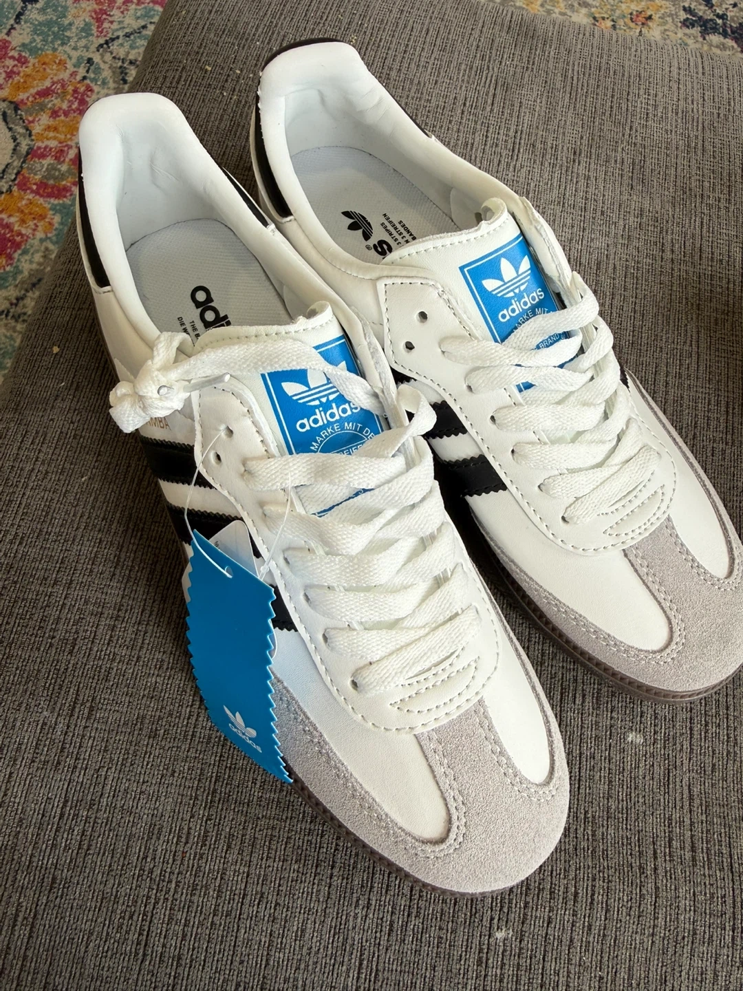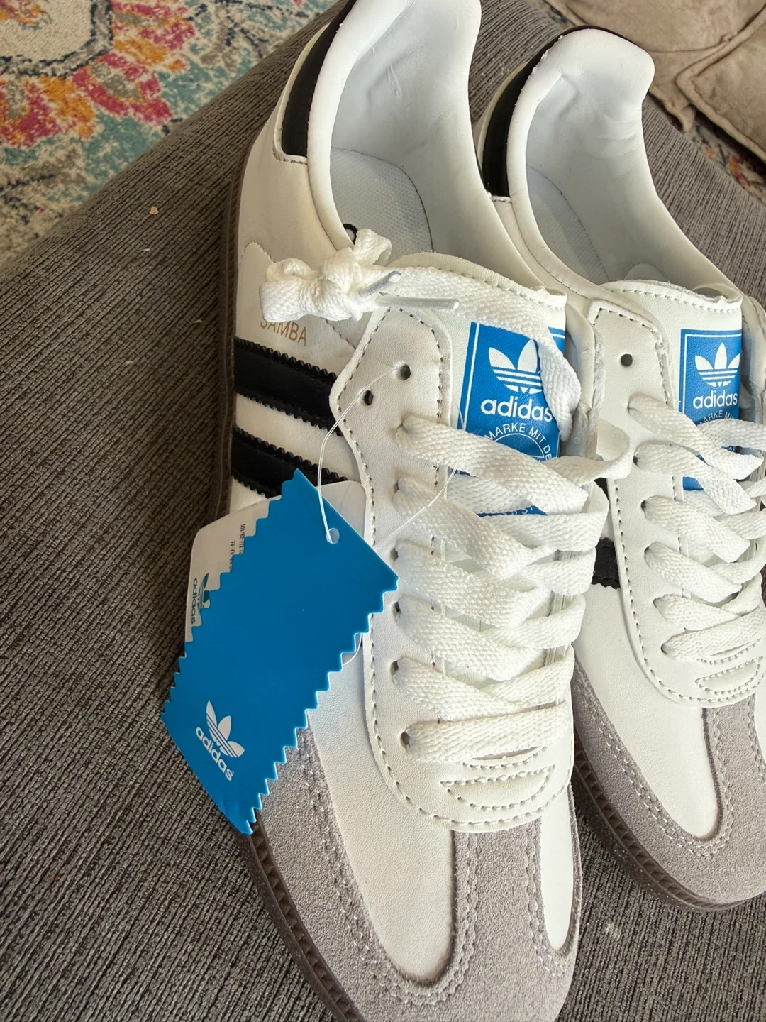 Brand new Adidas Samba sneakers in classic white and black. These shoes are made with a leather and suede upper and feature the iconic three stripes. They're perfect for everyday wear or casual outings.