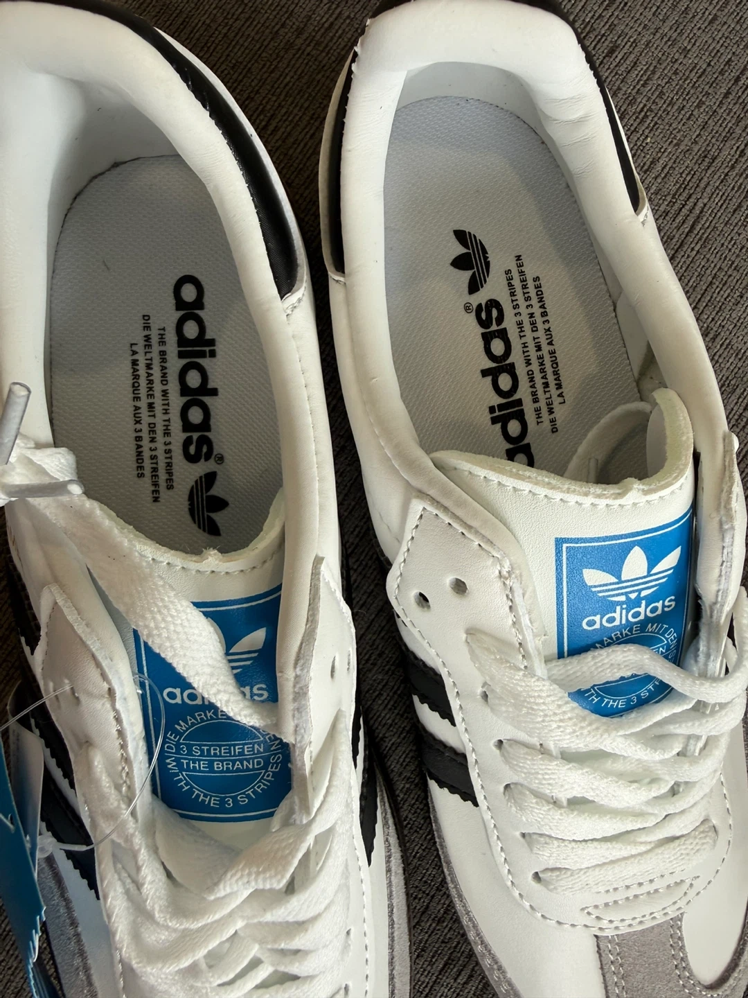 Brand new Adidas Samba sneakers in classic white and black. These shoes are made with a leather and suede upper and feature the iconic three stripes. They're perfect for everyday wear or casual outings.