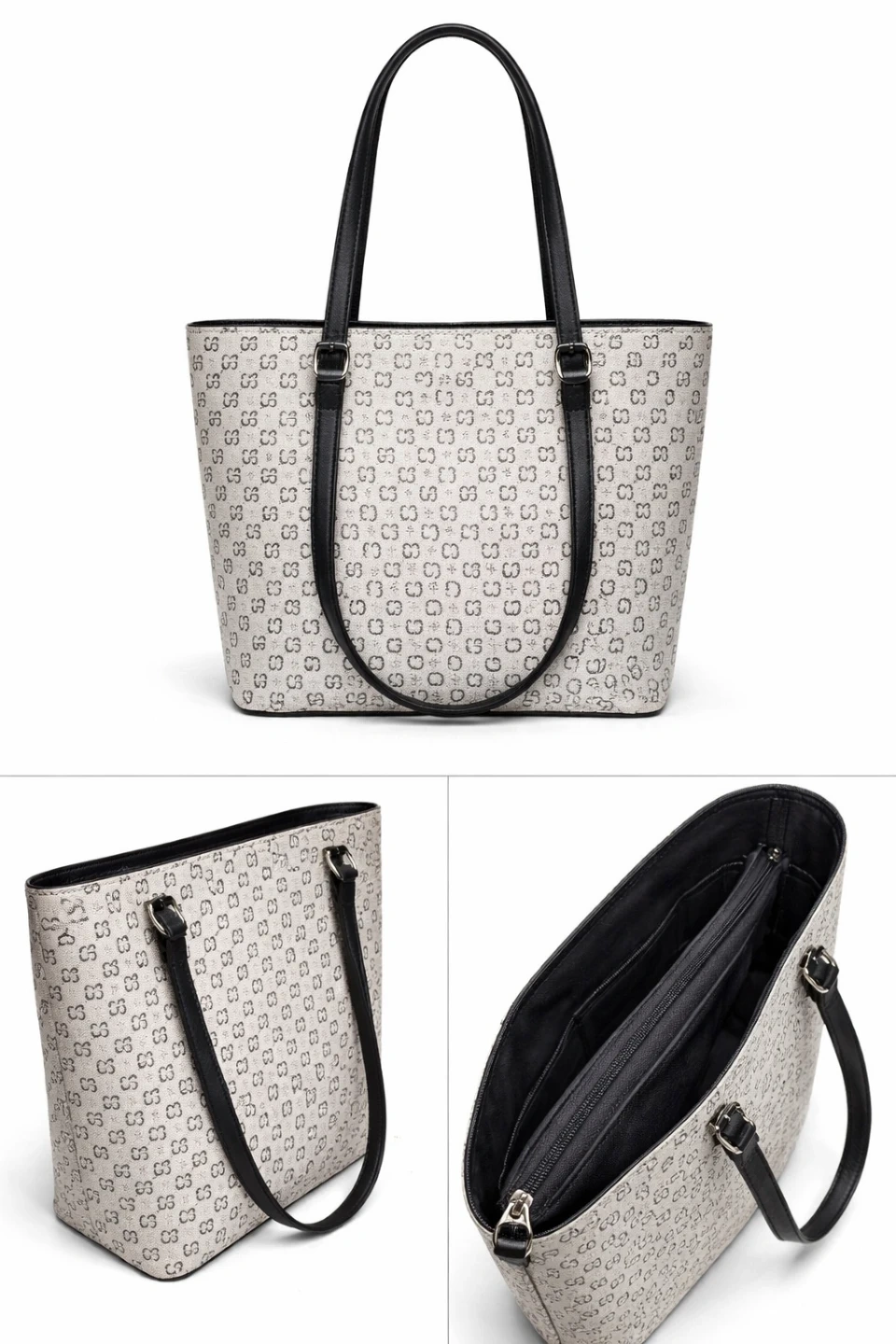 This stylish tote bag features an all-over logo pattern and black faux leather handles. It includes a zippered main compartment and an interior zippered pocket for organization. It's a practical and chic accessory for everyday use!