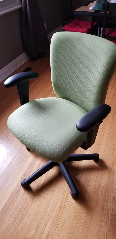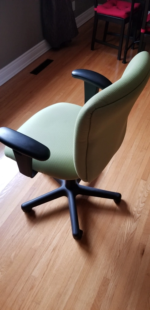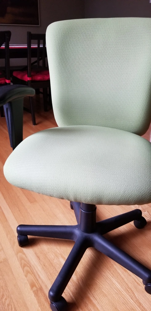 Comfortable office chair. Light green fabric. Adjustable height. Five-star base with casters. Black armrests. Clean, good working condition.