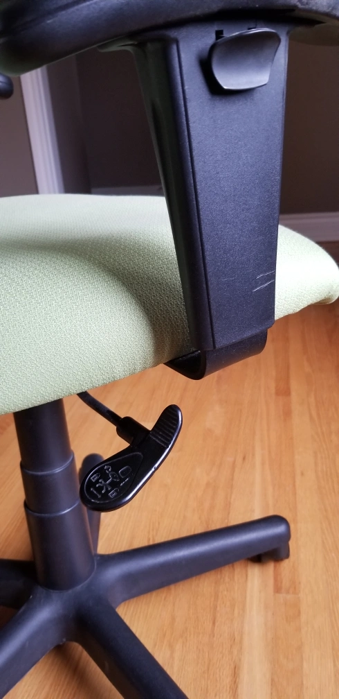 Comfortable office chair. Light green fabric. Adjustable height. Five-star base with casters. Black armrests. Clean, good working condition.