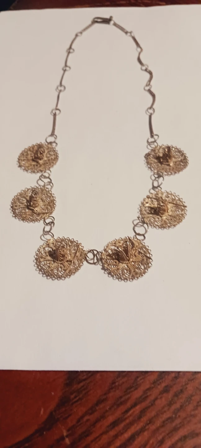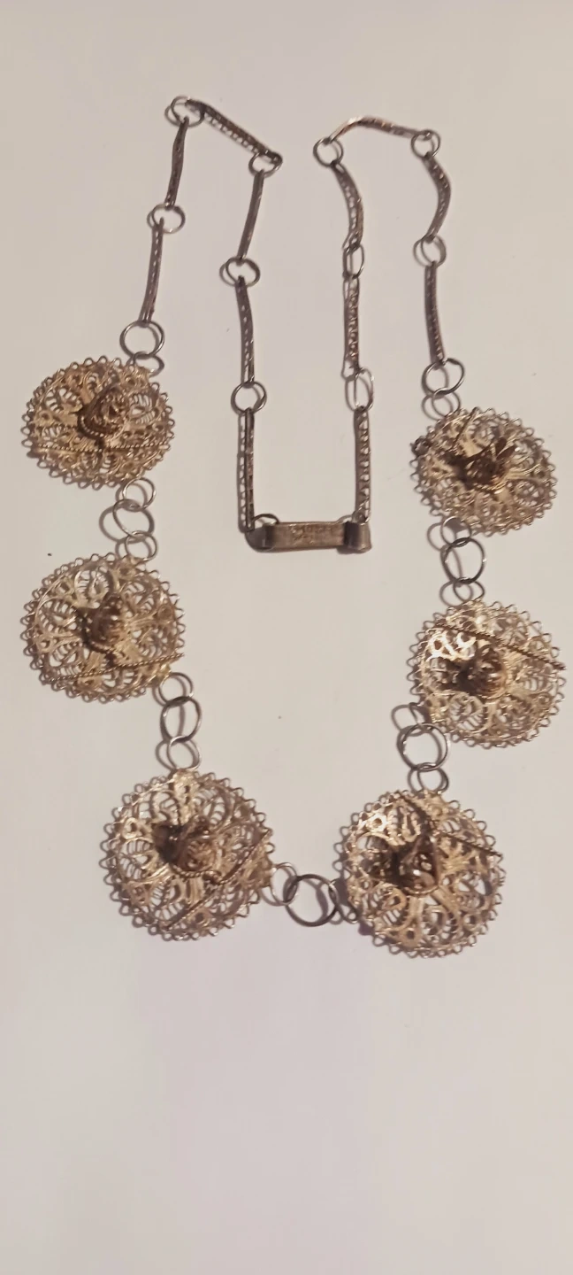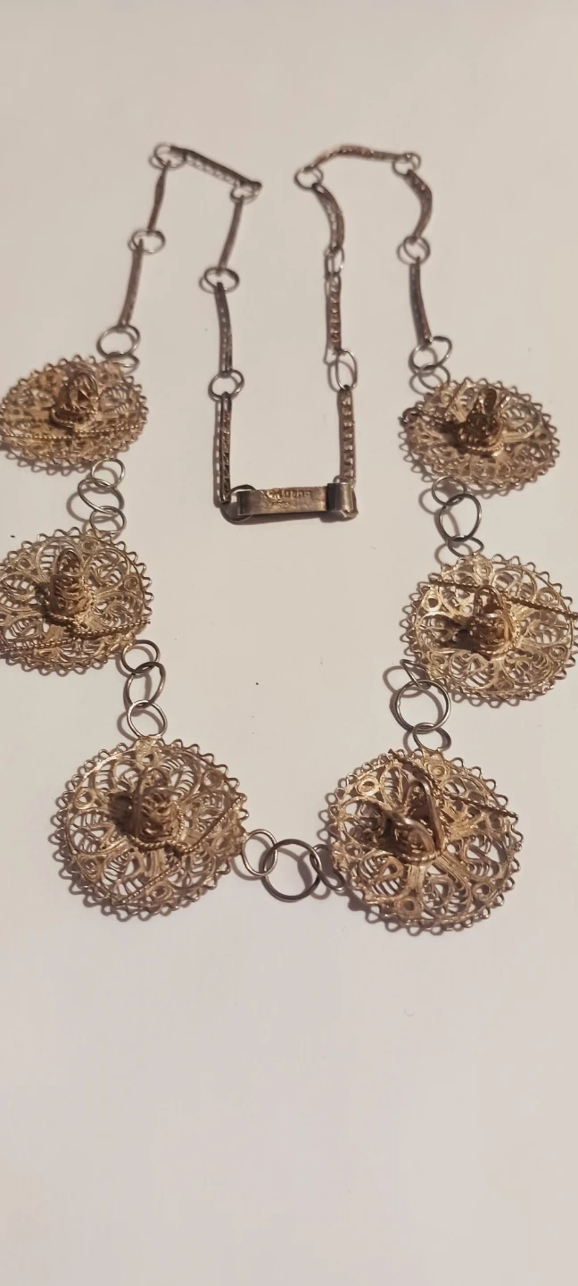 Sterling Silver 925 Gorgeous Filigree Sombrero Hat Charms Necklace. Elegant delicate vintage necklace with intricate filigree work. It features multiple ornate circular Sombrero Hat pendants connected by a delicate chain. The clasp appears to be stamped 925 with a maker's mark. 18" long. Excellent condition. 18" long. ALL MY PRICES ARE NEGOTIABLE !!