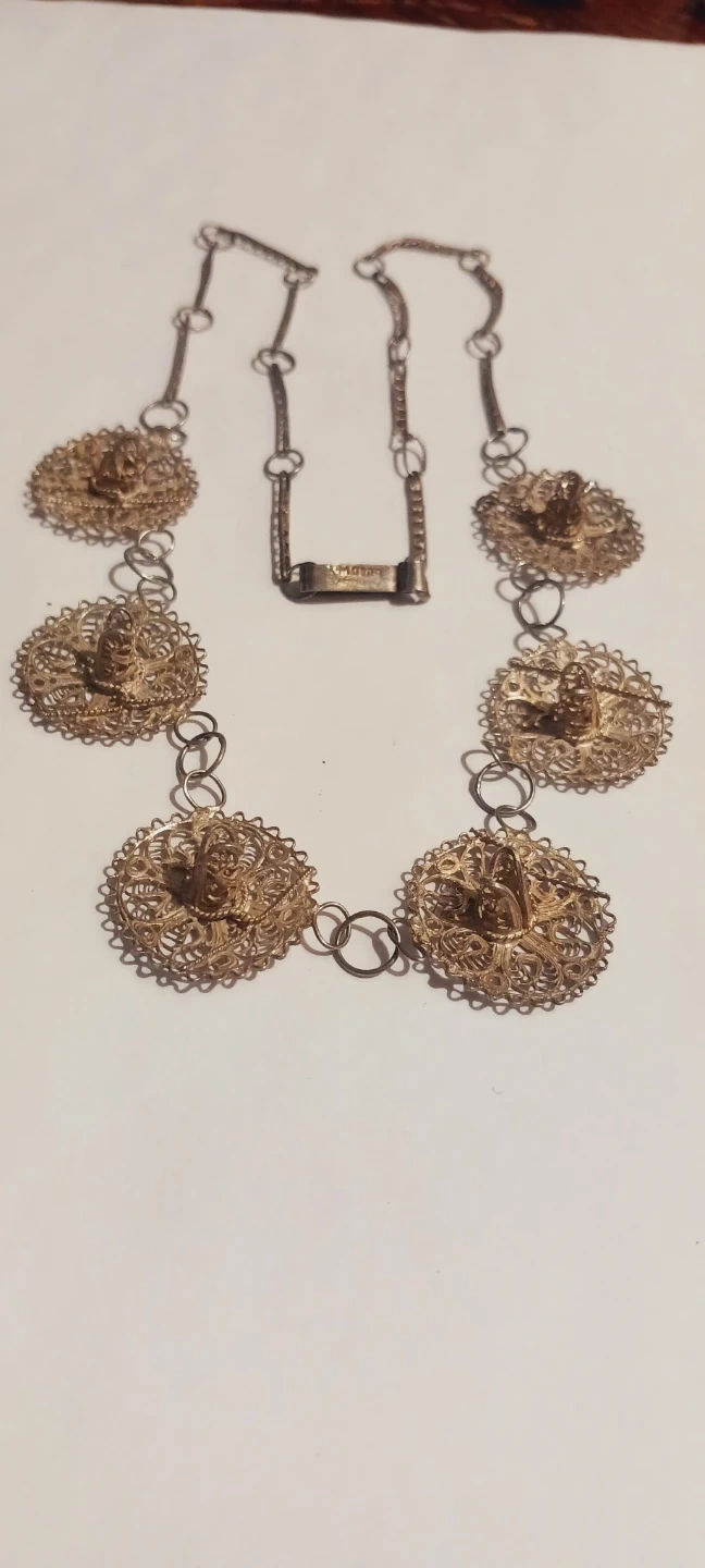 Sterling Silver 925 Gorgeous Filigree Sombrero Hat Charms Necklace. Elegant delicate vintage necklace with intricate filigree work. It features multiple ornate circular Sombrero Hat pendants connected by a delicate chain. The clasp appears to be stamped 925 with a maker's mark. 18" long. Excellent condition. 18" long. ALL MY PRICES ARE NEGOTIABLE !!