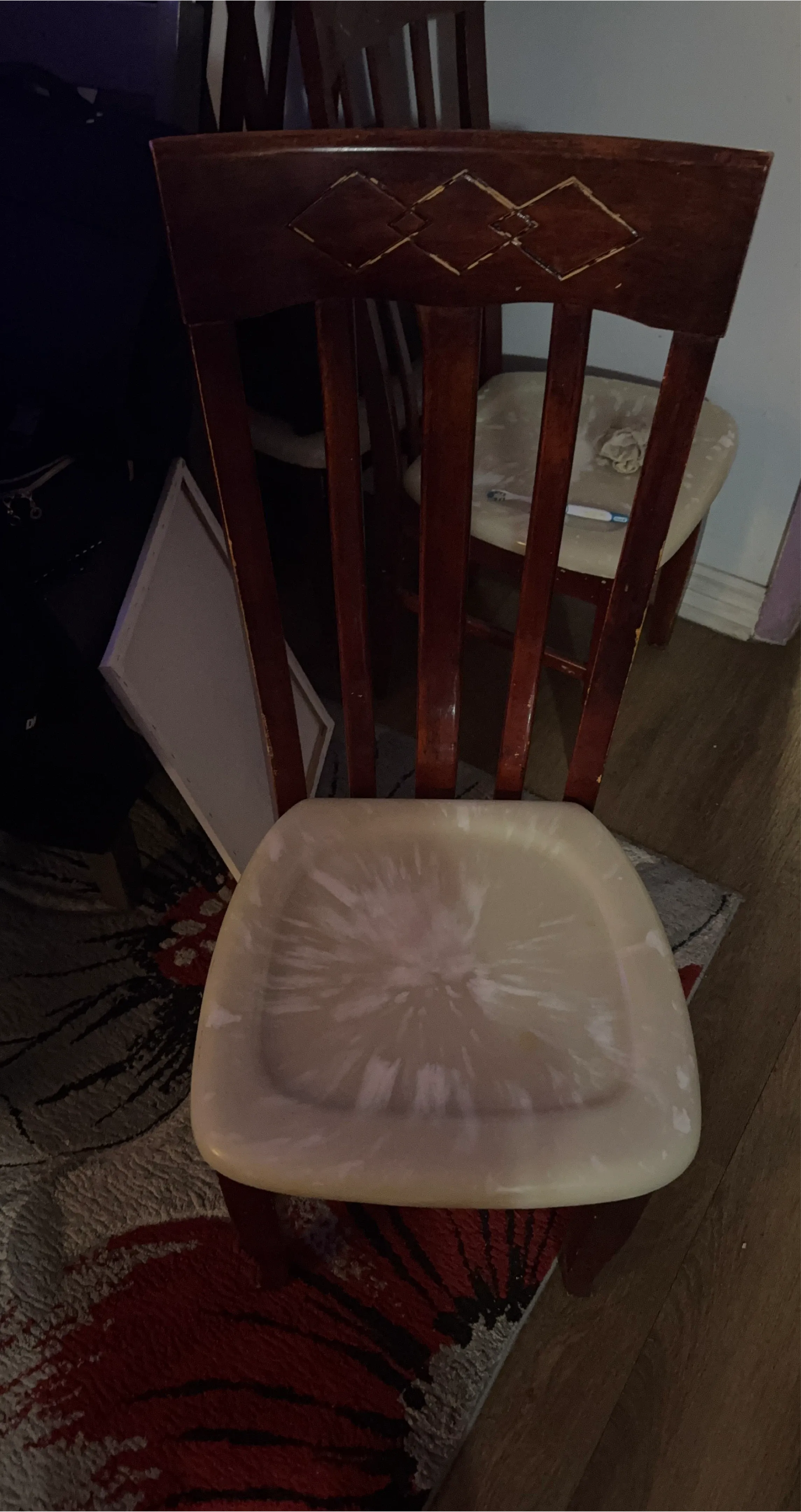 This is a wooden dining chair with a cushioned seat. The wood has a dark cherry finish. The seat is upholstered in a light cream or beige marble with a swirled pattern. It has a slatted backrest with decorative diamond shapes at the top. A solid, functional chair for any dining room or kitchen.