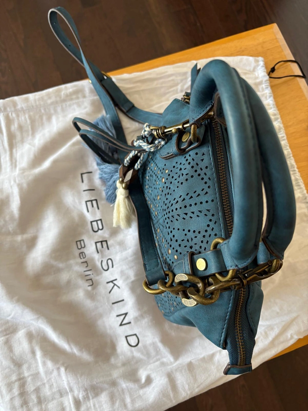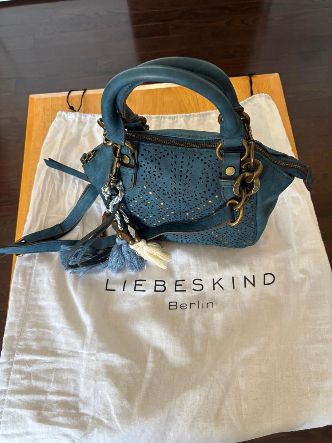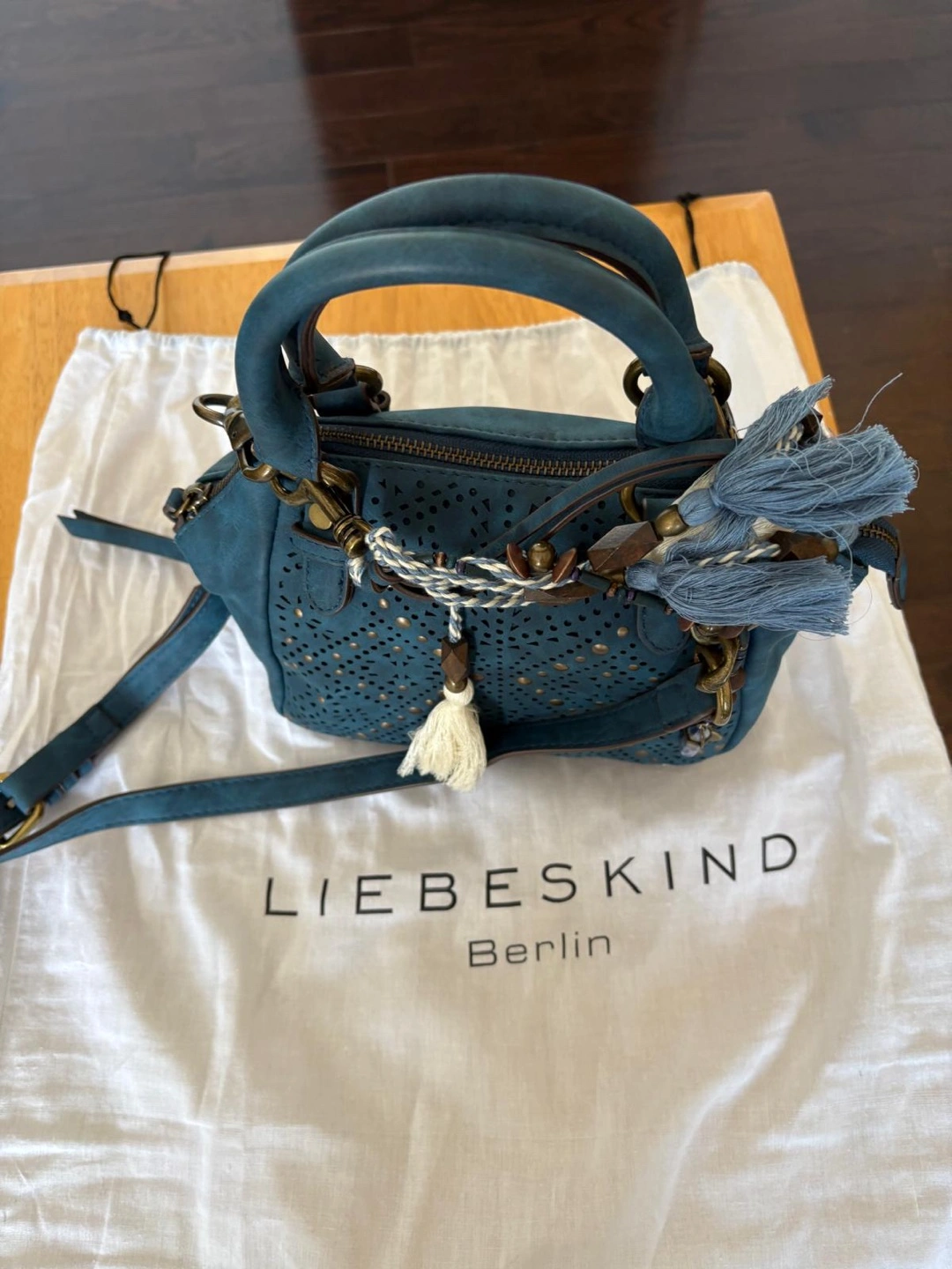 Buy & SellLiebeskind Berlin Teal Blue Laser Cut Satchel HandbagLiebeskind Berlin Teal Blue Laser Cut Satchel Handbag$75Beautiful teal blue satchel. Laser cut detailing. Features a detachable shoulder strap and tassels. Comes with dust bag.ConditionNewBrandLiebeskind BerlinWHERE TO MEETSteeles & BathurstView MapSELLERverifiedLeilaBathurst Manor1469 reviews0 chats·3 favorites·72 viewsSEND CHAT TO SELLERHi Leila! I’m interested in your listing.Hi Leila! I’m interested in your listing.Get the Karrot app to chatSign In to chat