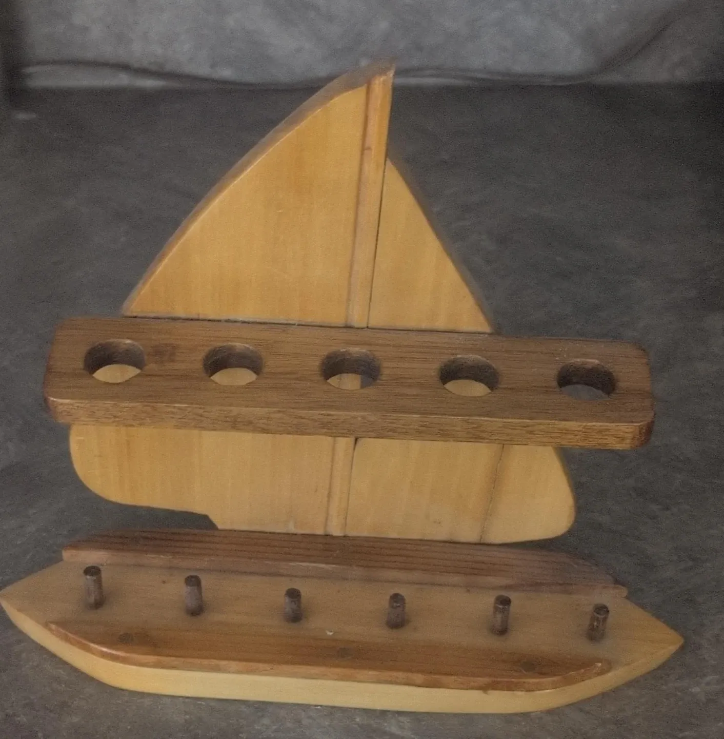 Wooden sailboat pipe holder with slots for 5 pipes. Features a base with pegs for holding pipe stems. Made of wood.