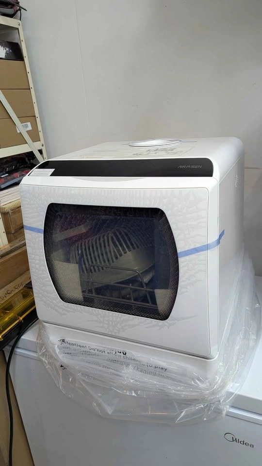 Brand new, still factory sealed. Compact AIRMSEN TDQR03 countertop dishwasher. This mini portable unit has a 5-liter built-in water tank and an air-dry function. It has 5 washing programs including baby care, glass, and fruit wash. White color. Dimensions are about 16.75in wide, 18.05in high, and 16.86in deep. Fits dishes up to 10.25in tall.