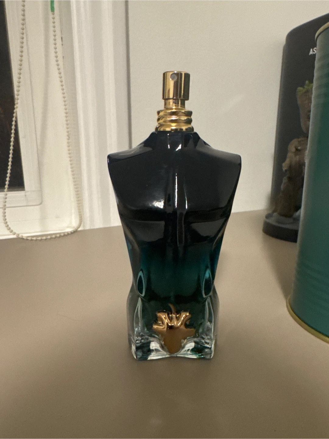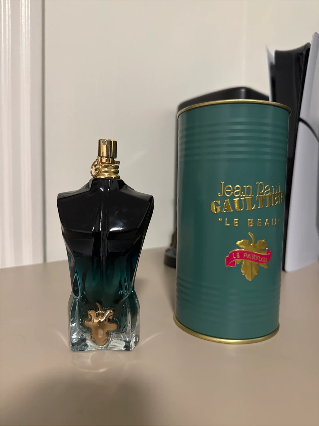 This is the Jean Paul Gaultier "Le Beau" Le Parfum. It comes in a unique bottle shaped like a torso and includes its original green tin packaging. It's a fragrance for men.