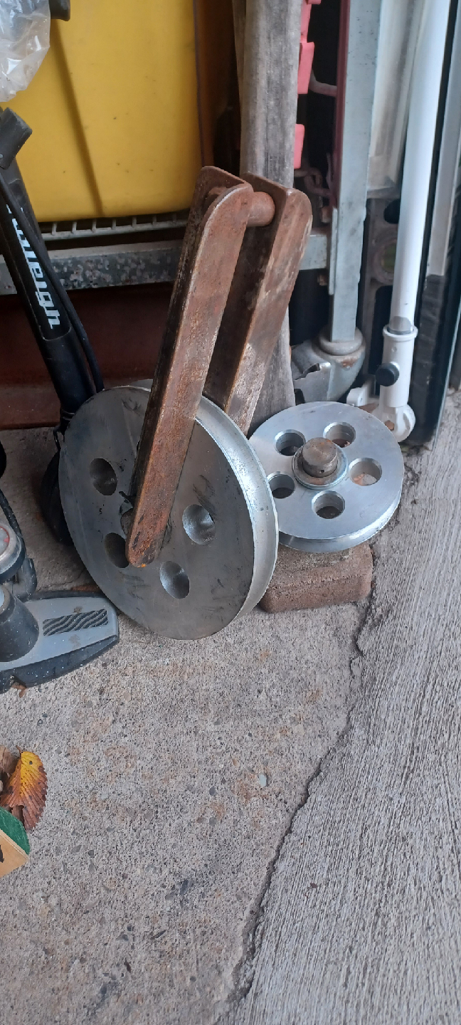 Selling a metal pulley, great for various projects or tasks! It shows some signs of use, but is still functional and ready for a new home