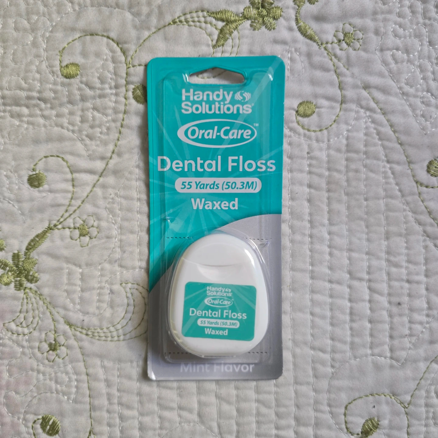 This is Handy Solutions Oral-Care dental floss. It's waxed and comes in mint flavor. The floss is 55 Yards (50.3M) long.