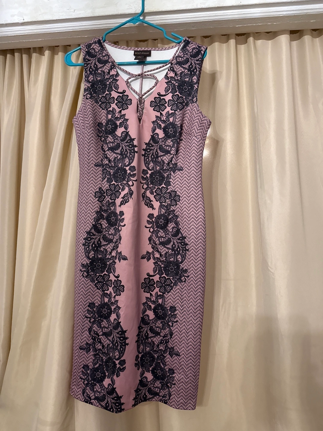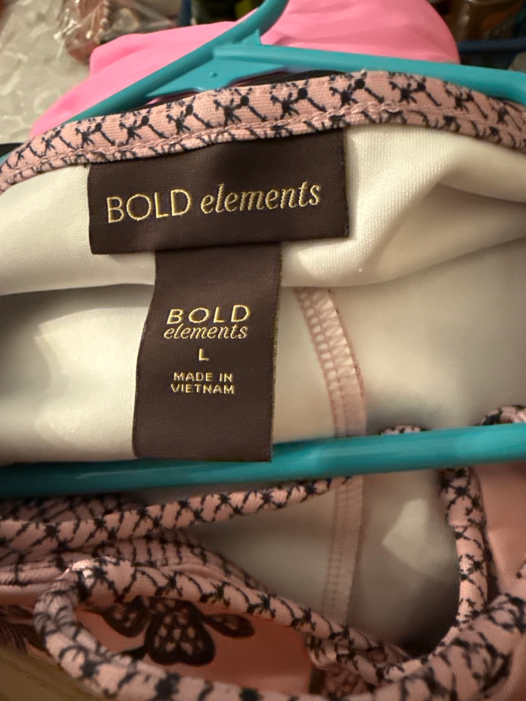 Selling a BOLD elements dress in size L. The dress features a stylish design with a pink and black color scheme. It's made in Vietnam and has a unique pattern. Perfect for any occasion!