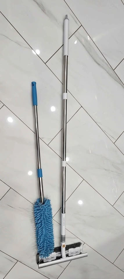 Selling 2 cleaning tools: A glass cleaner wiper with a cloth attachment, great for windows, mirrors, shower glass, and tiles. Also a microfiber duster mop, perfect for walls, baseboards, ceilings, and hard-to-reach areas. Both are lightweight, easy to use, and have adjustable handles. Both are clean and in good working condition.